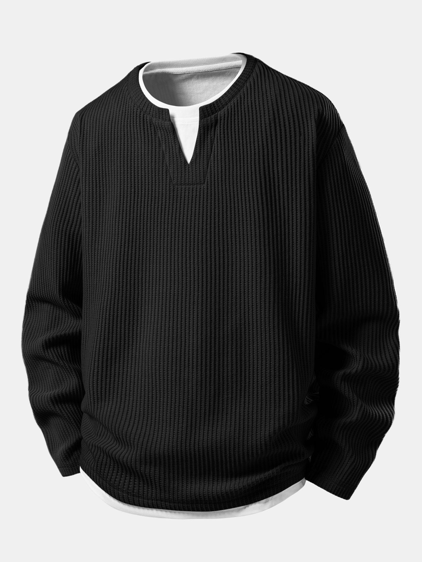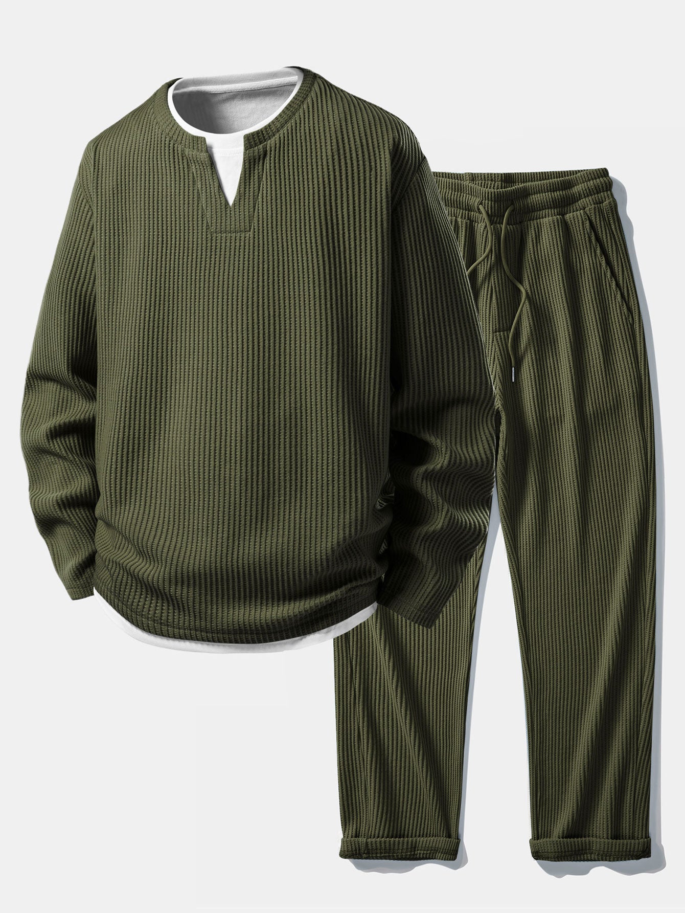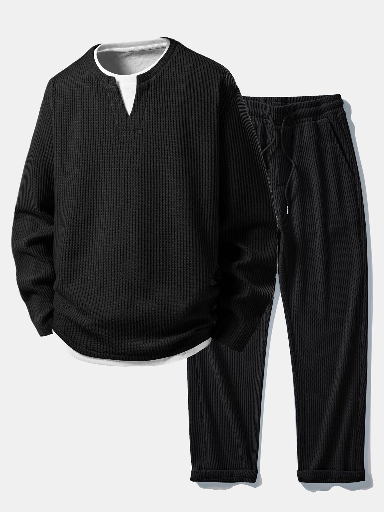 The 2-in-1 notched collar T-shirt features a relaxed fit with a layered-look design that adds depth and modern appeal, while the drawstring knitted waffle pants offer comfort and flexibility with a soft, breathable feel. Perfect for lounging, casual outings, or laid-back streetwear looks, this set combines texture, comfort, and contemporary style.