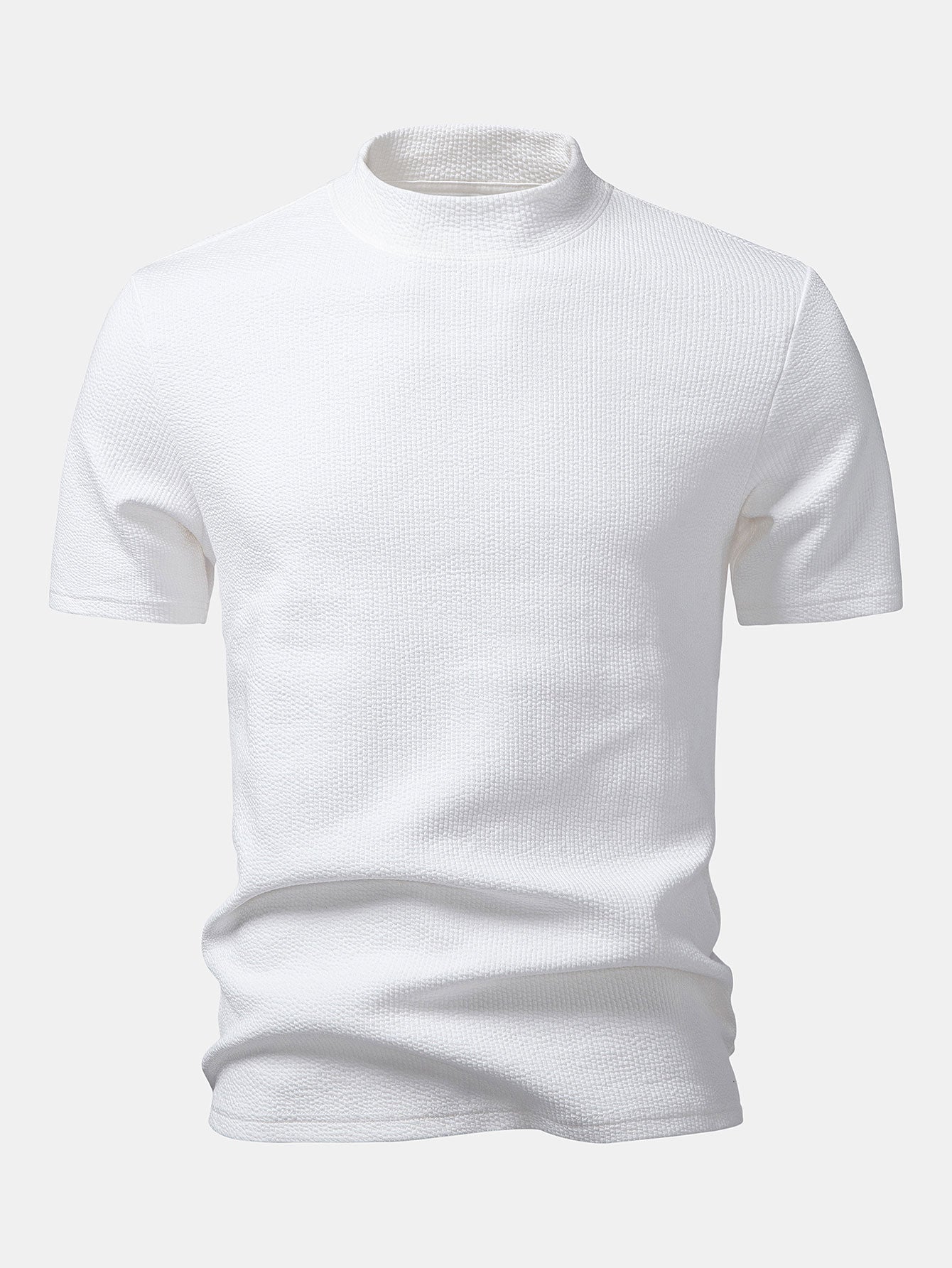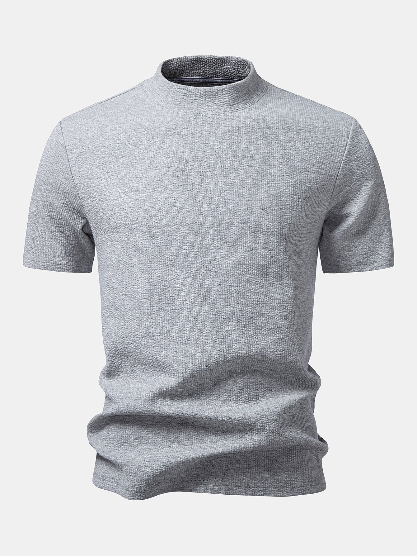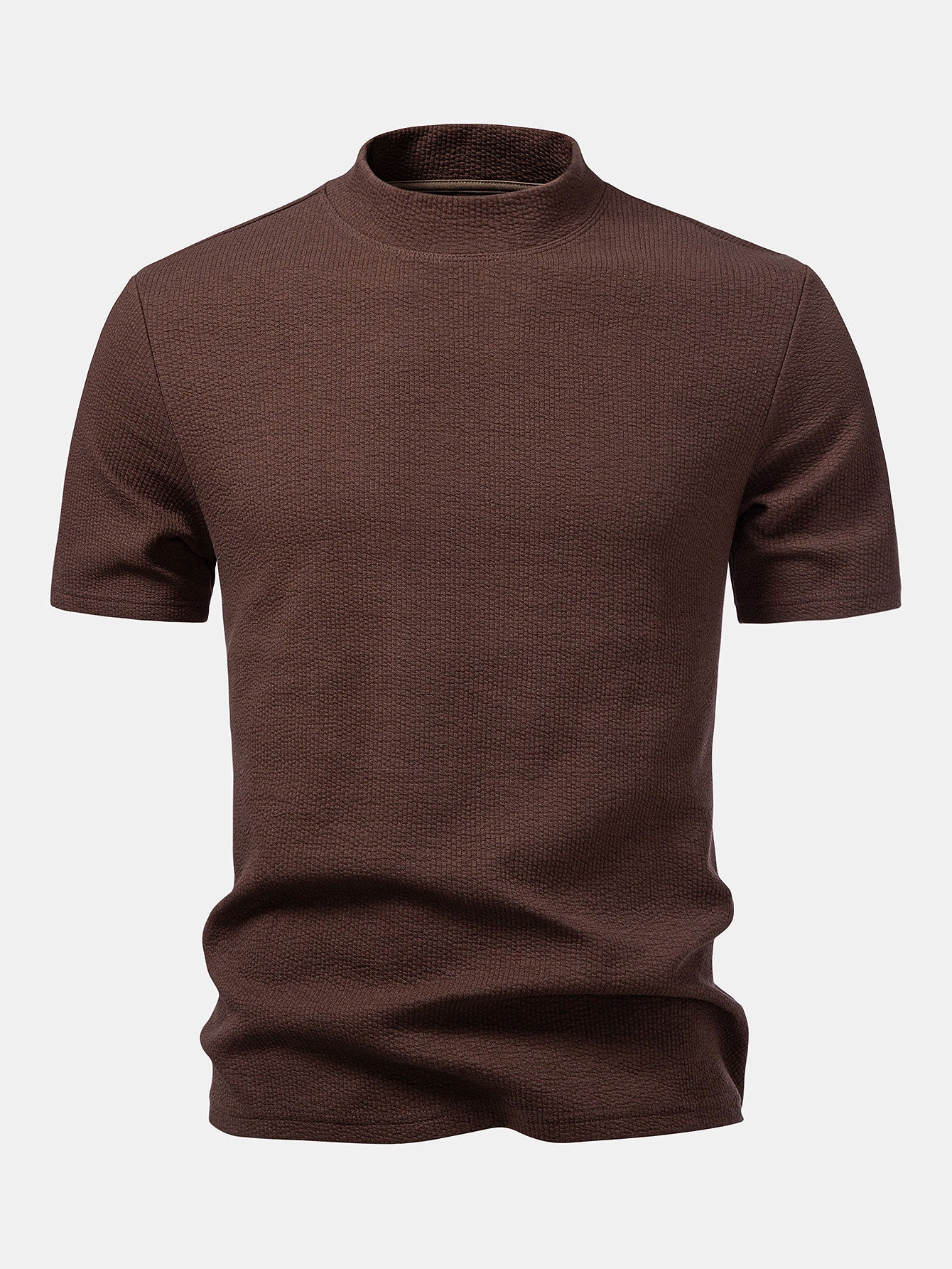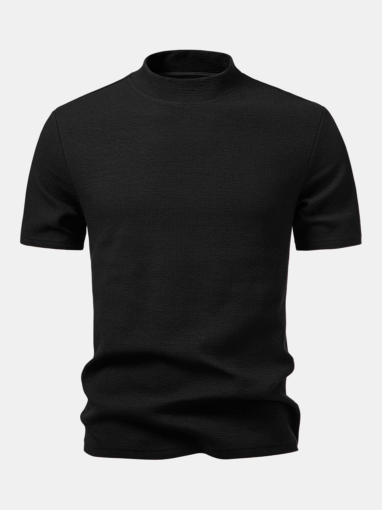 Crafted from soft, breathable fabric with a subtle textured finish, this T-shirt delivers both comfort and modern style. The mock neck design adds a refined touch, making it perfect for casual wear or elevated smart-casual looks.