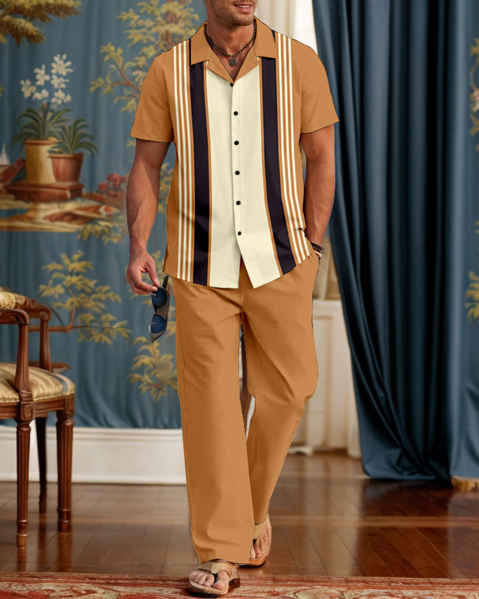 Suitmens Men's Classic Bowling Shirt Contrasting Stripes Walking Suit