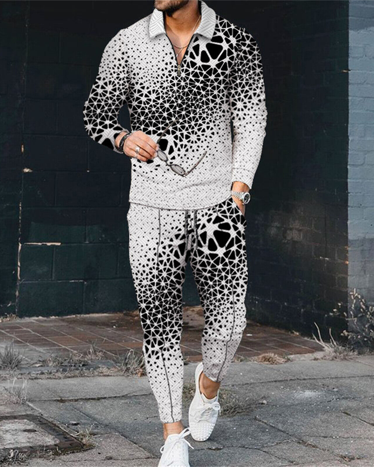 Suitmens Men's Gradient Geometry Long Sleeve Zipped POLO Trousers Set 0264