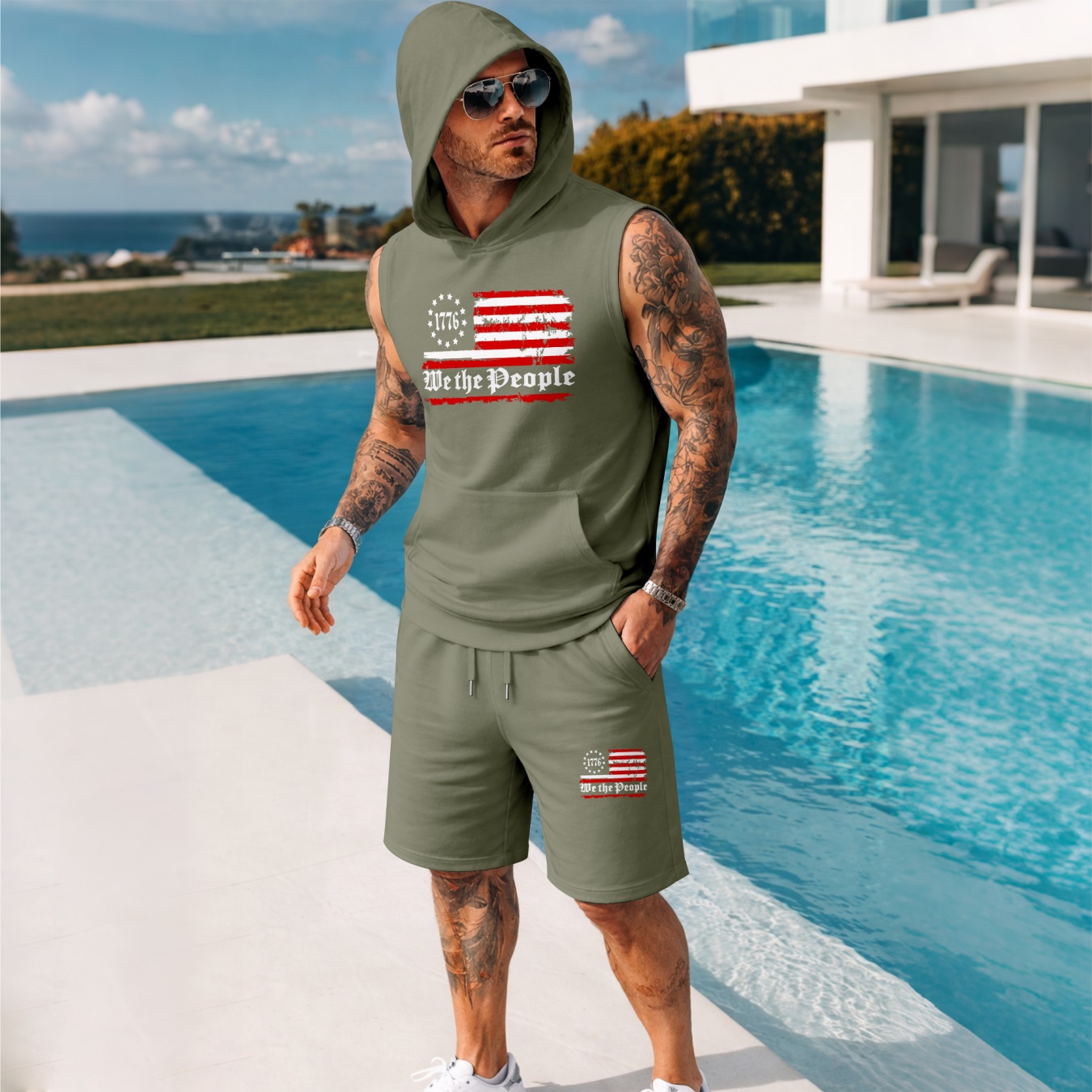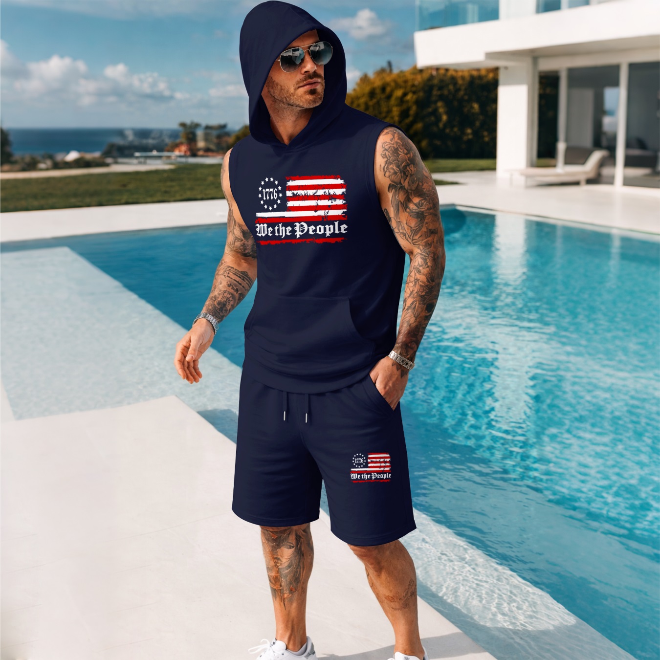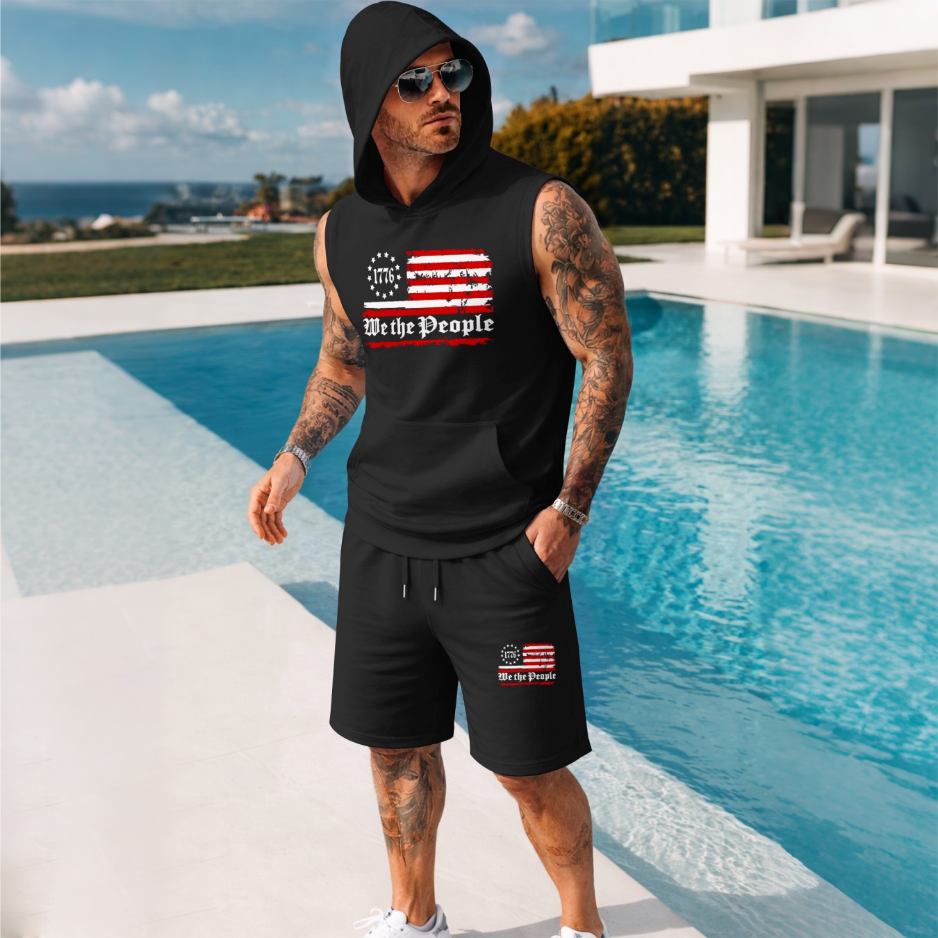 Two-Piece Set Men's American Flag PrintHooded Tank Top & Shorts Set, Regular FitCasual Athletic Fashion Activewear SleevelessTop & Shorts, Men's Summer Clothes