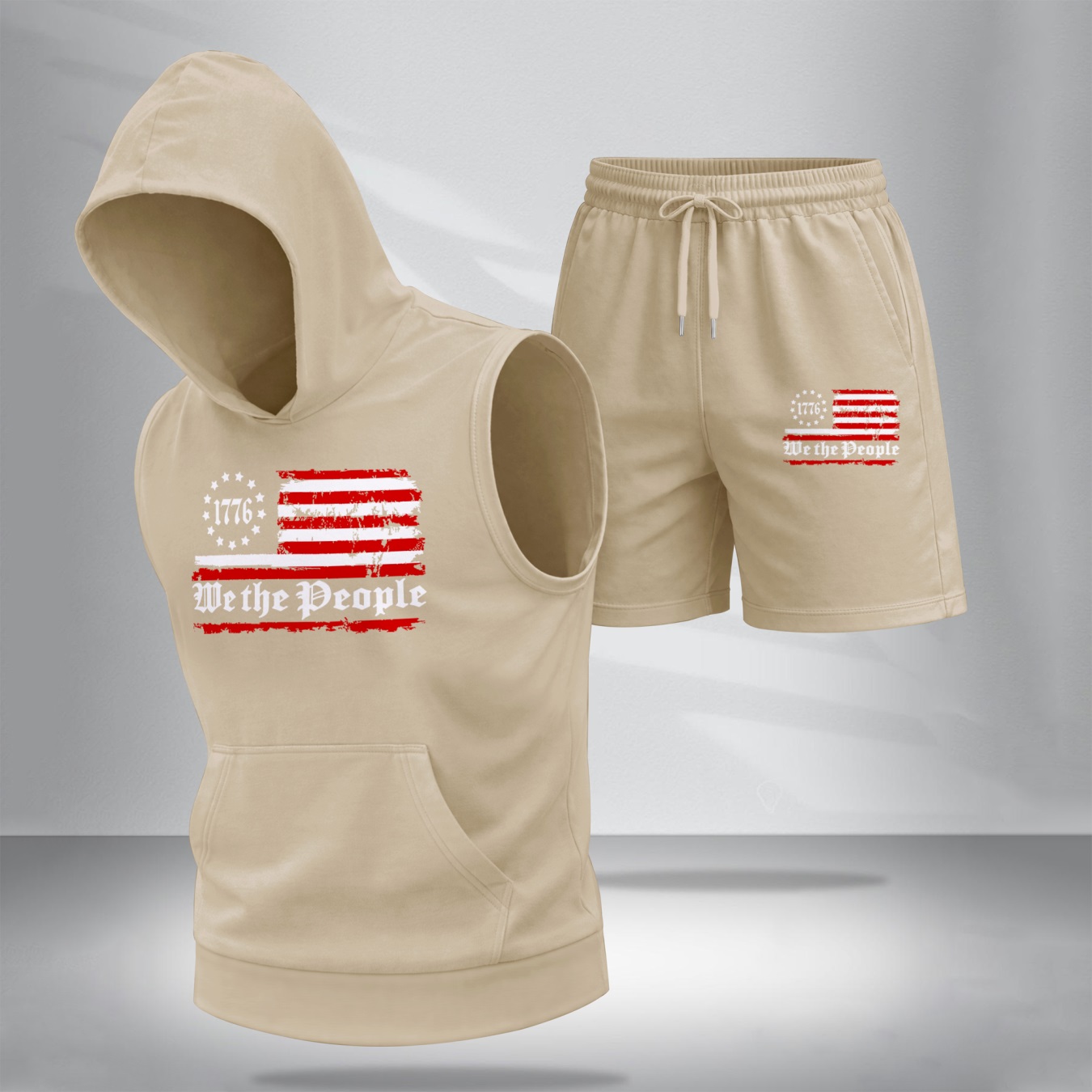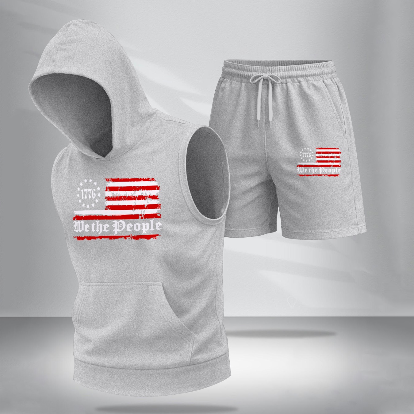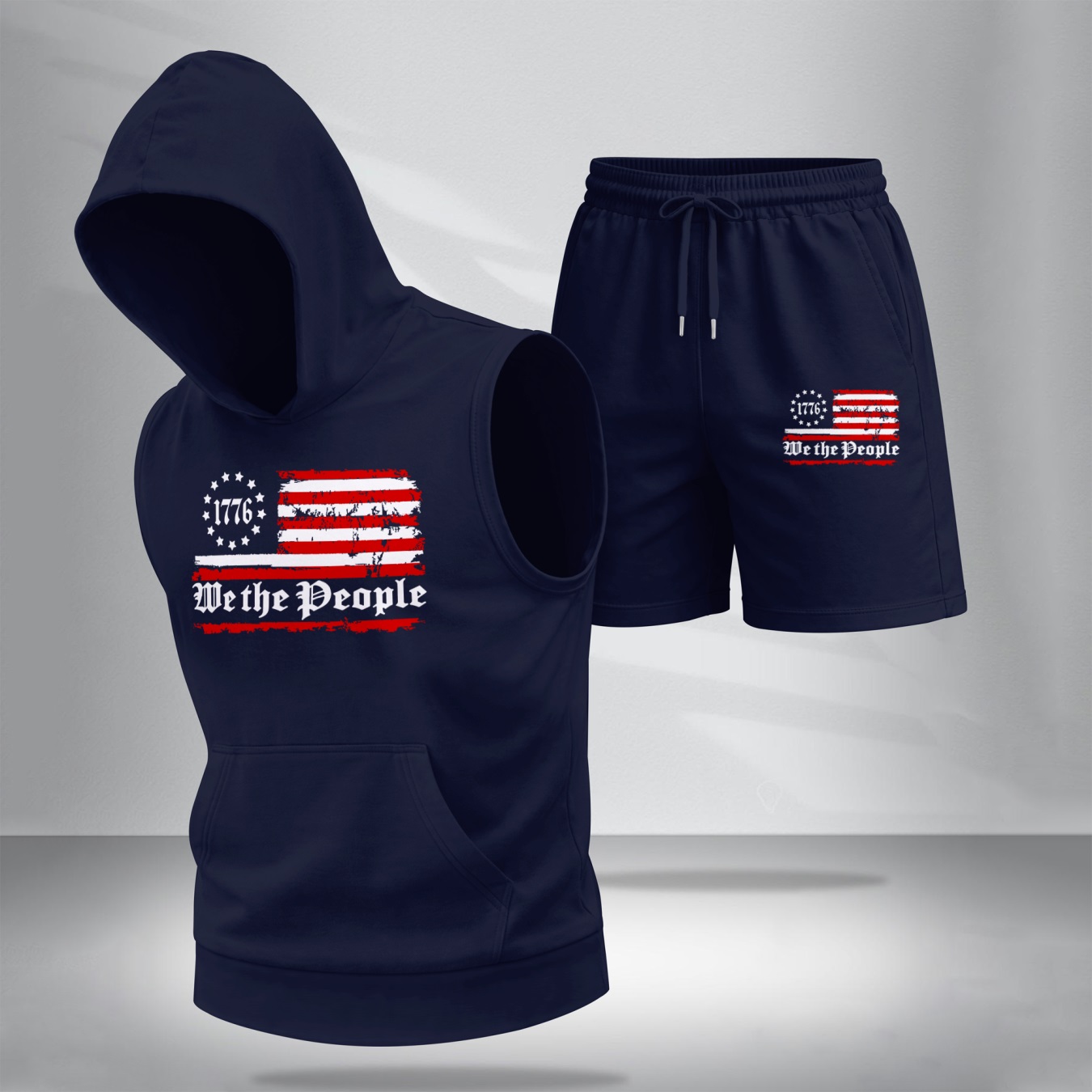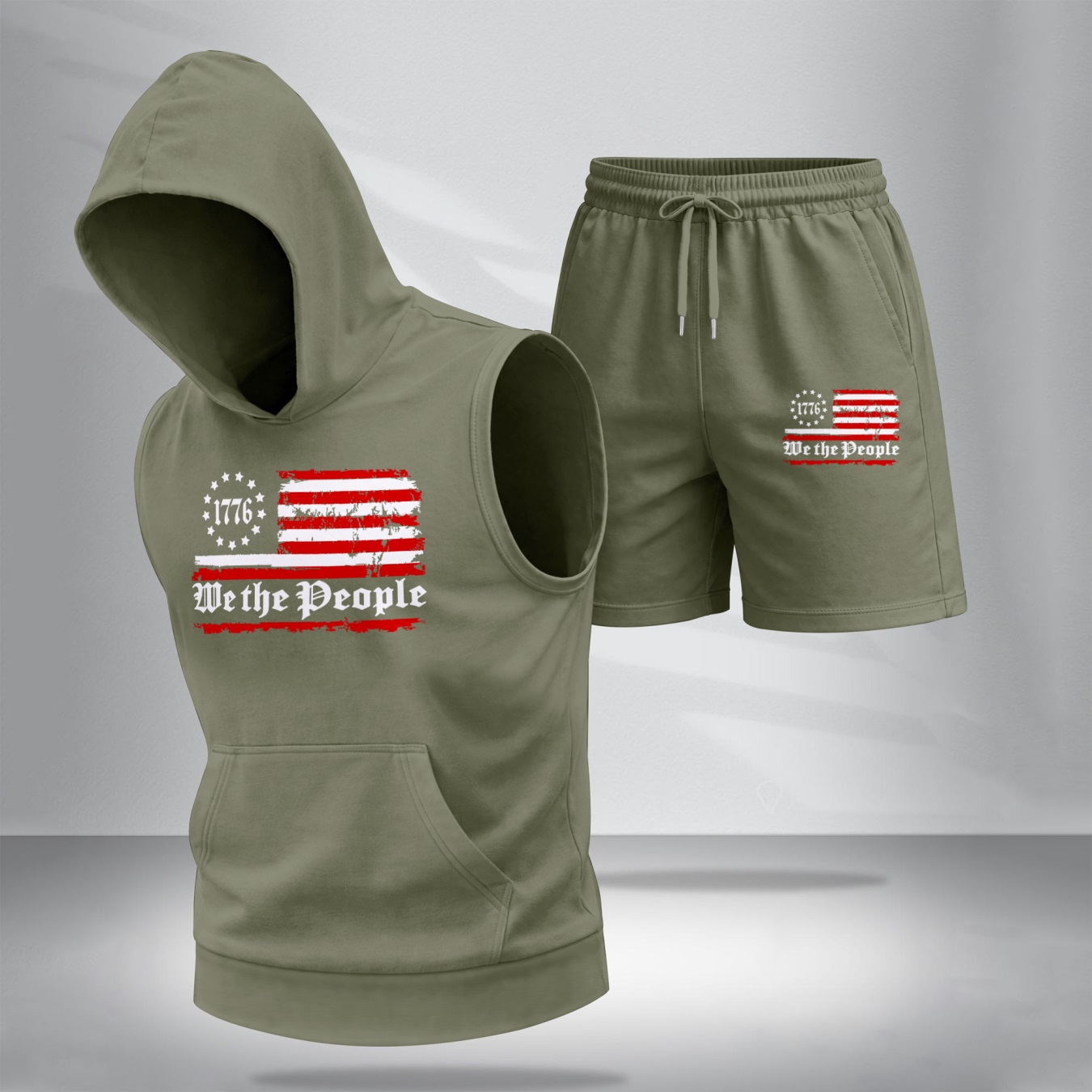 Two-Piece Set Men's American Flag PrintHooded Tank Top & Shorts Set, Regular FitCasual Athletic Fashion Activewear SleevelessTop & Shorts, Men's Summer Clothes
