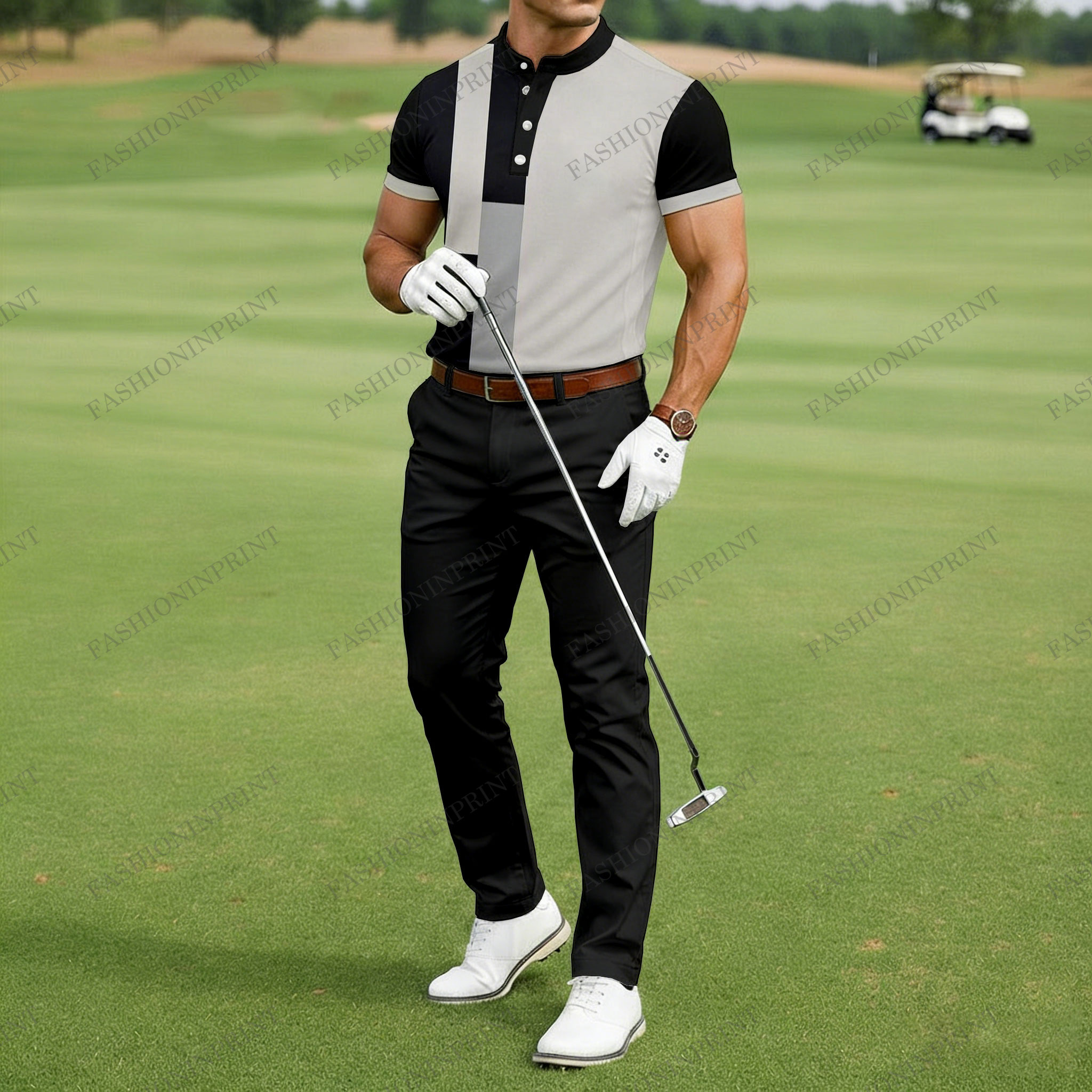 Men's Casual Black & Gray Color Matching Printed Henley Collar Short Sleeved T-Shirt & Trousers Two-Piece Set