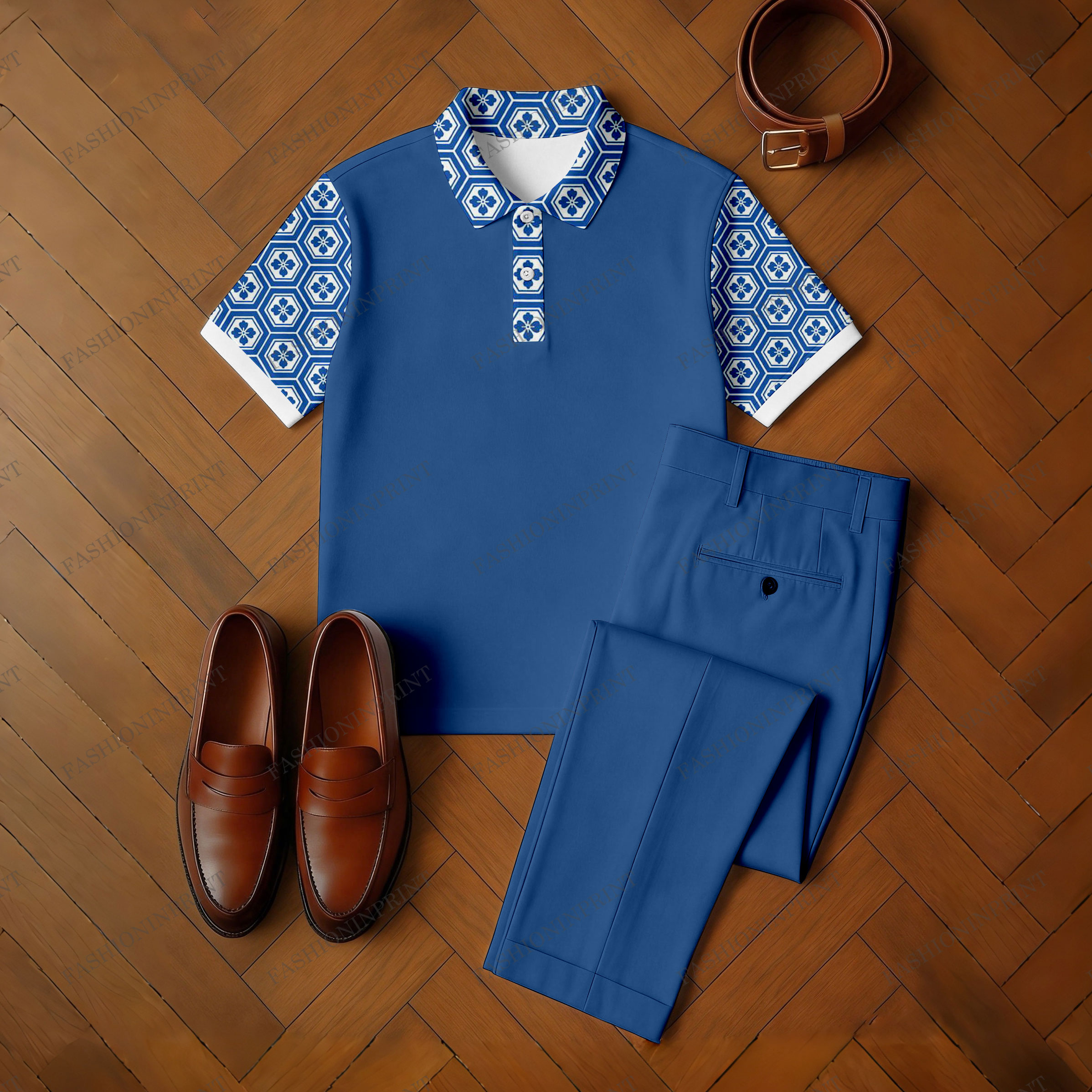 Men's Casual Blue & White Color Matching Retro Style Printed Short Sleeved Polo Shirt & Trousers Two-Piece Set