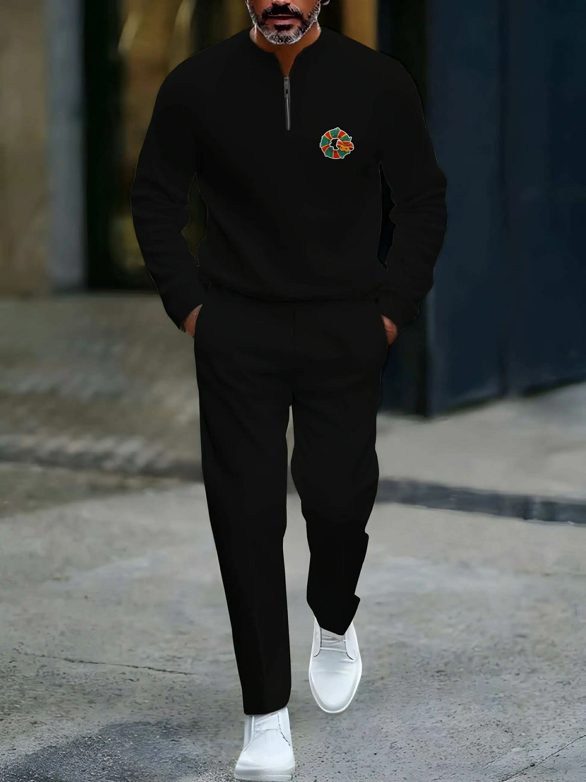Men's Casual Black Color Matching Christmas Printed Round-Neck Zipper Long Sleeved Sweatshirt & Trousers Two-Piece Set