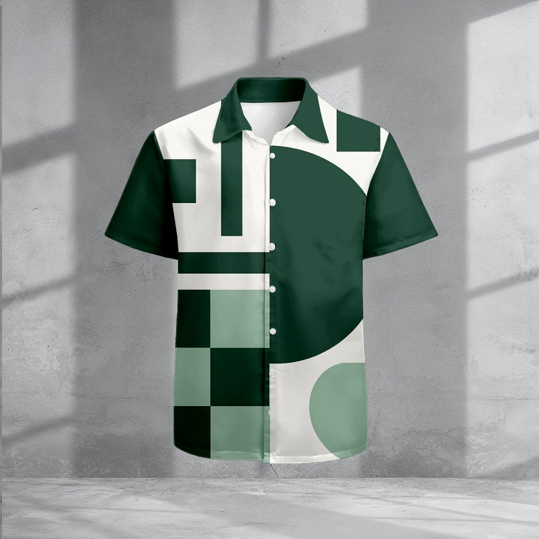 Men's Casual Green & White Color Matching Geometric Print Short-Sleeve Shirt