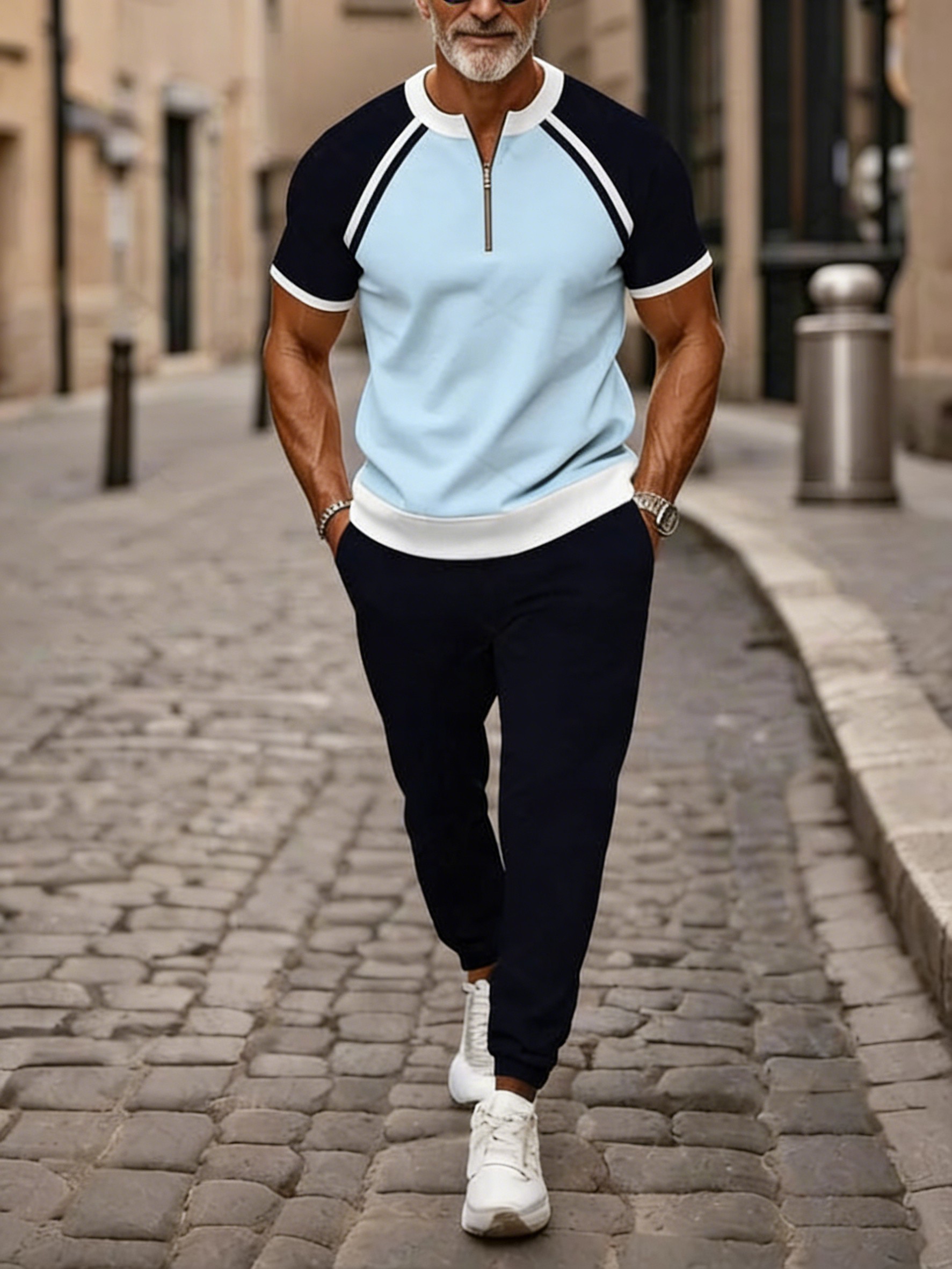 Men's Casual Blue & Black Color Matching Geometric Printed Round-Neck Zipper Short Sleeved Tops & Trousers Two-Piece Set