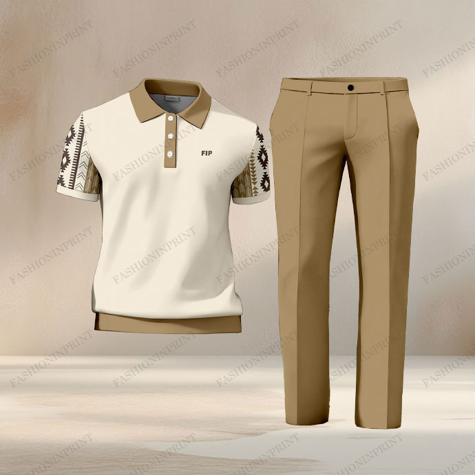 Men's Casual Khaki & Apricot Color Matching Geometric Printed Short Sleeved Polo Shirt & Trousers Two-Piece Set