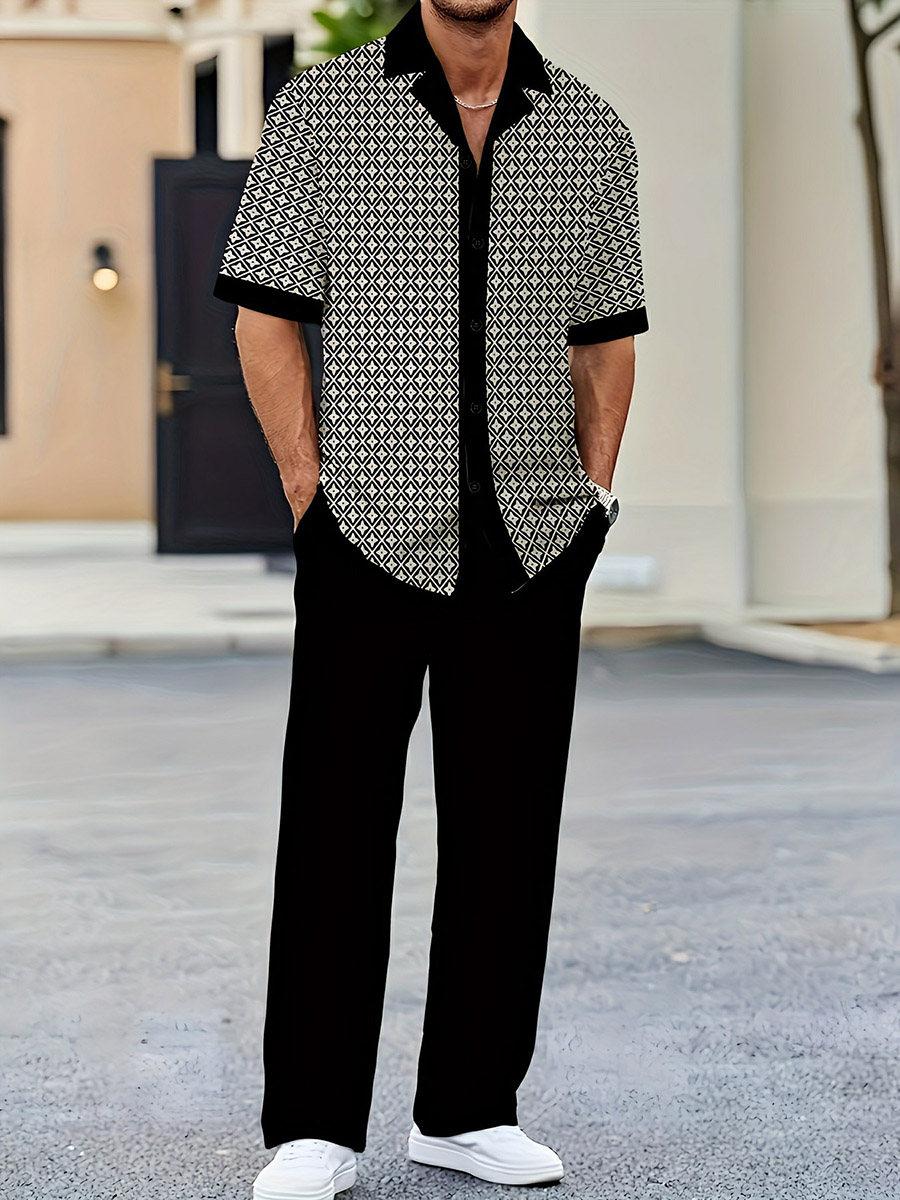 Men's Casual Black & White Color Matching Retro Style Printed Short Sleeved Shirt & Trousers Two Piece Set