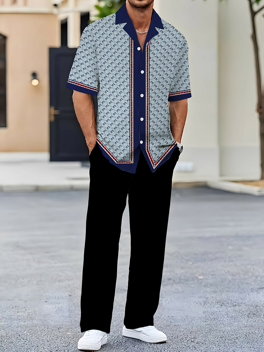 Men's Casual Black & Blue Color Matching Retro Style Printed Short Sleeved Shirt & Trousers Two Piece Set