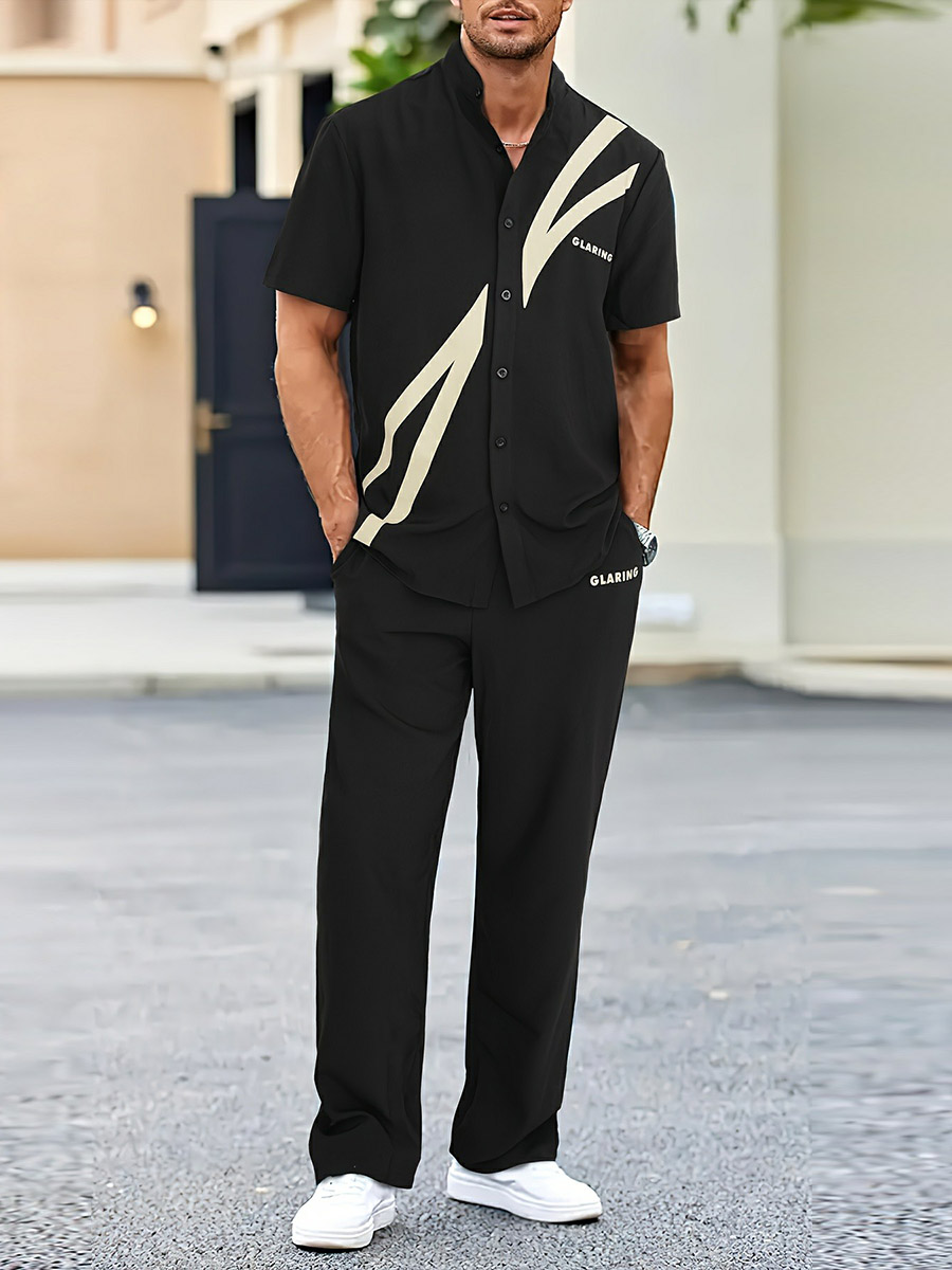 Men's Casual Black Color Matching Geometric Printed Short Sleeved Shirt & Trousers Two Piece Set