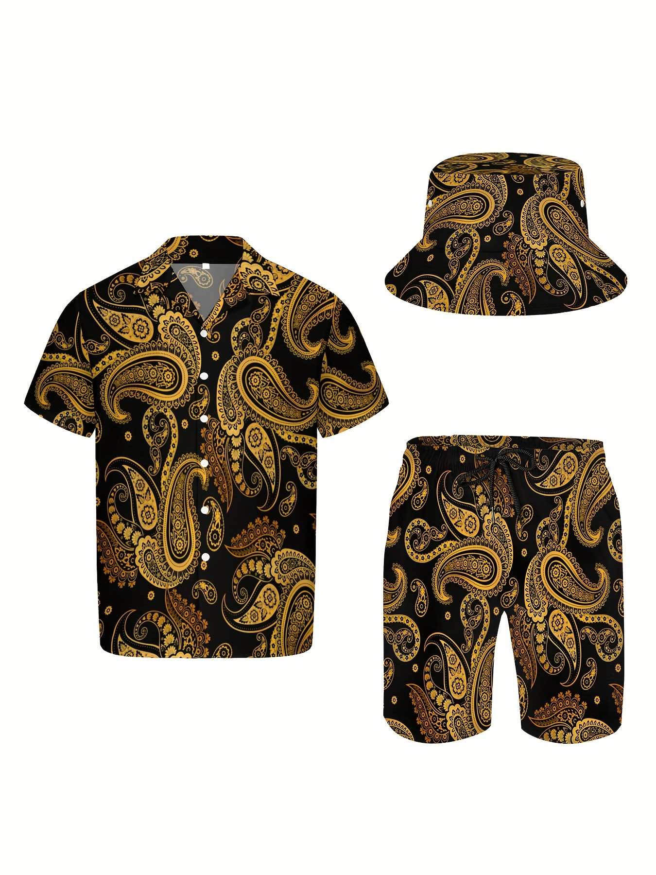 3pcs Men's Hawaiian Black & Gold Vintage Paisley Pattern Short Sleeves Shirt & Short & Fisherman's Hat