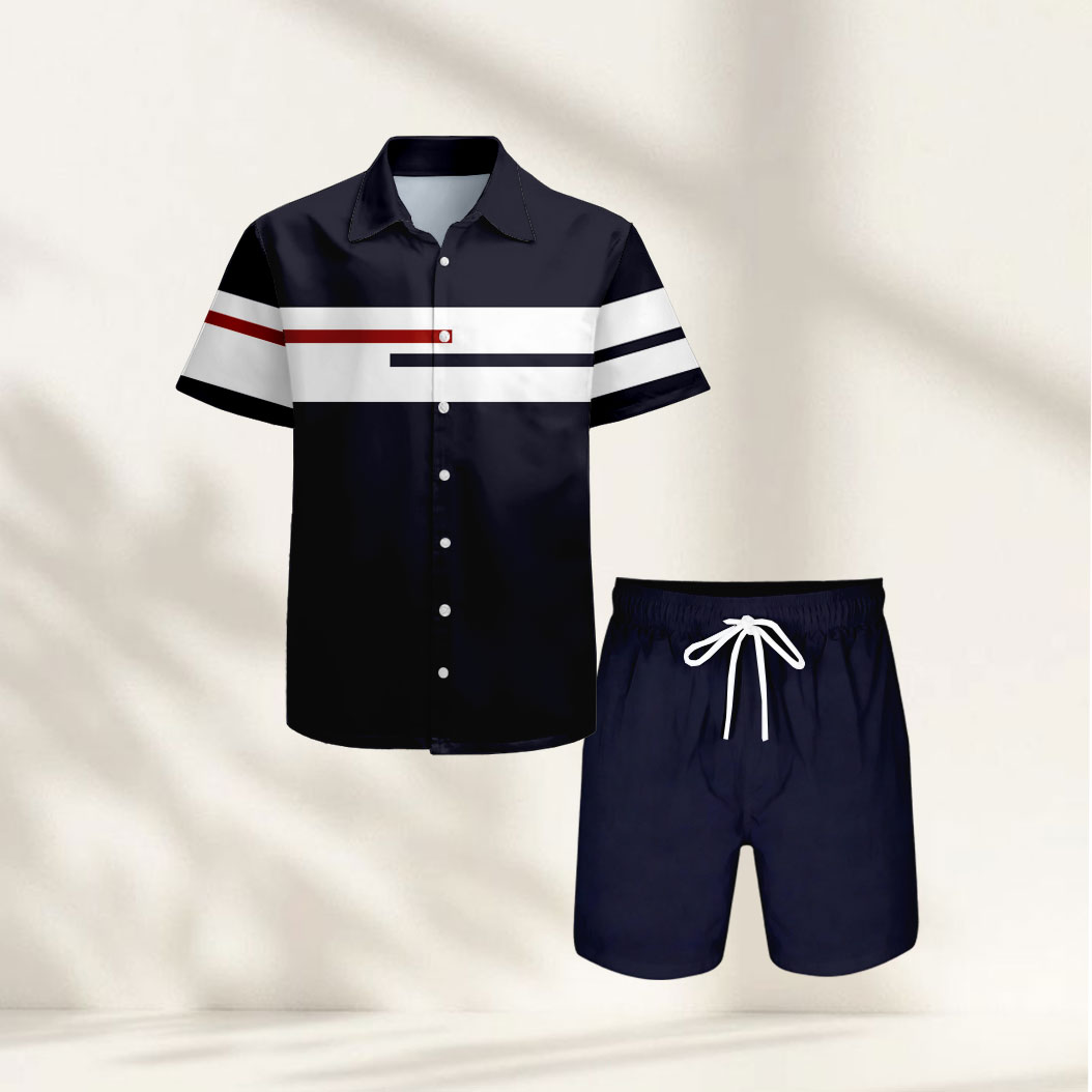 Men's Casual Navy & White Color Matching Striped Print Short-Sleeve Shirt & Shorts Two-Piece Set