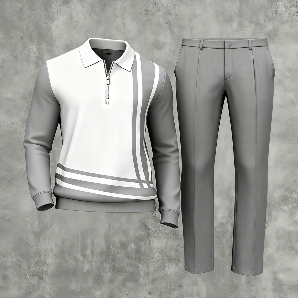 Men's Casual Color Matching Strped Printed Polo-Collar Zipper Long Sleeved Light Gray Trousers Two-Piece Set
