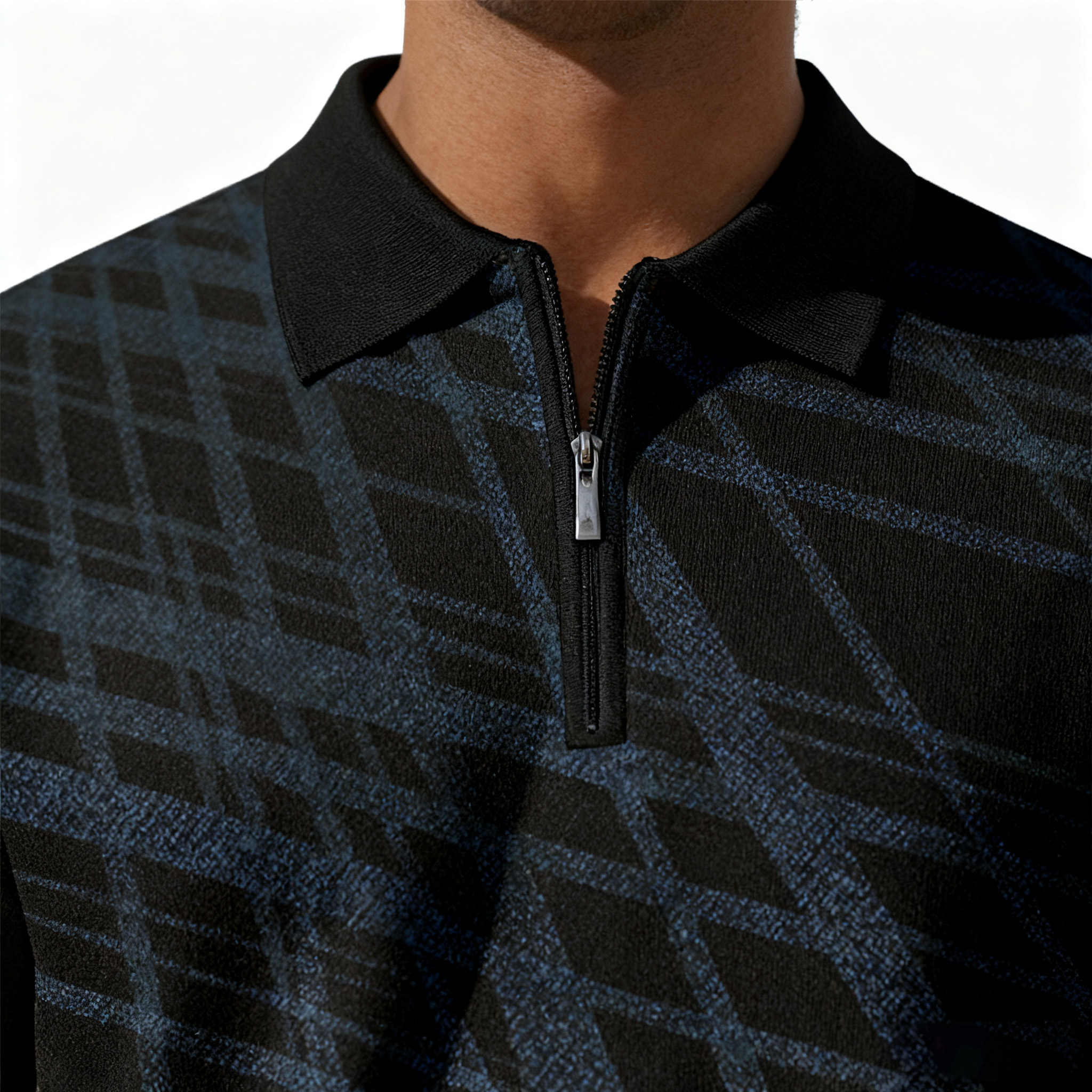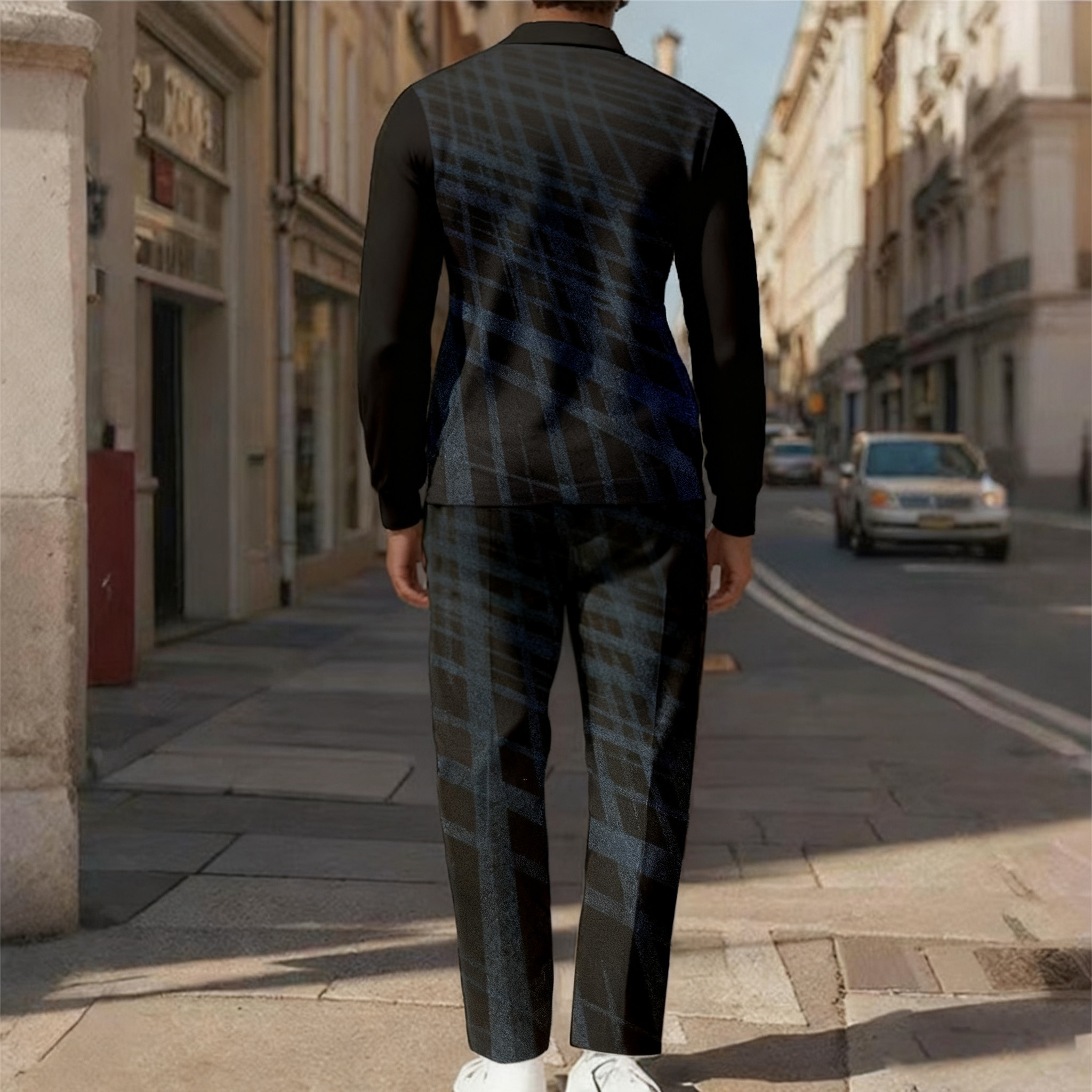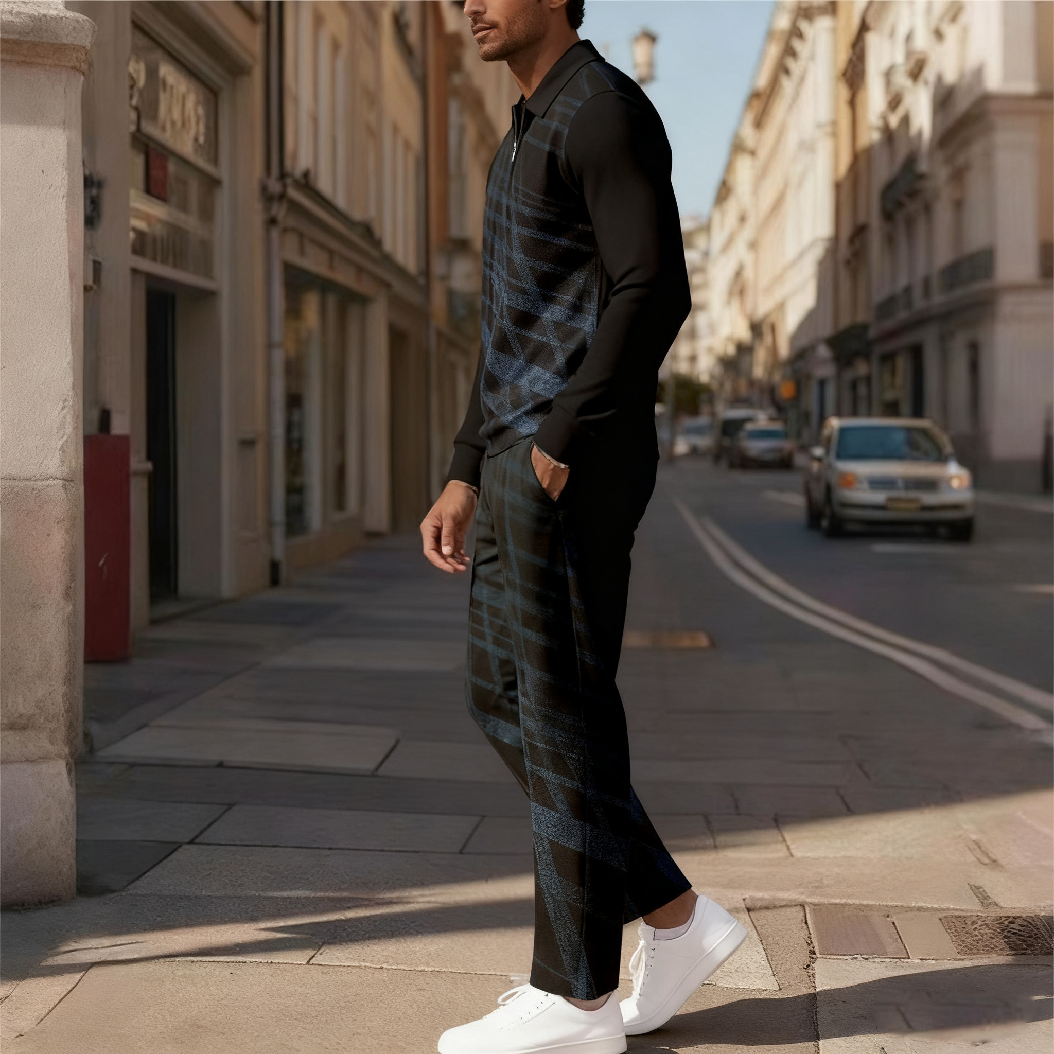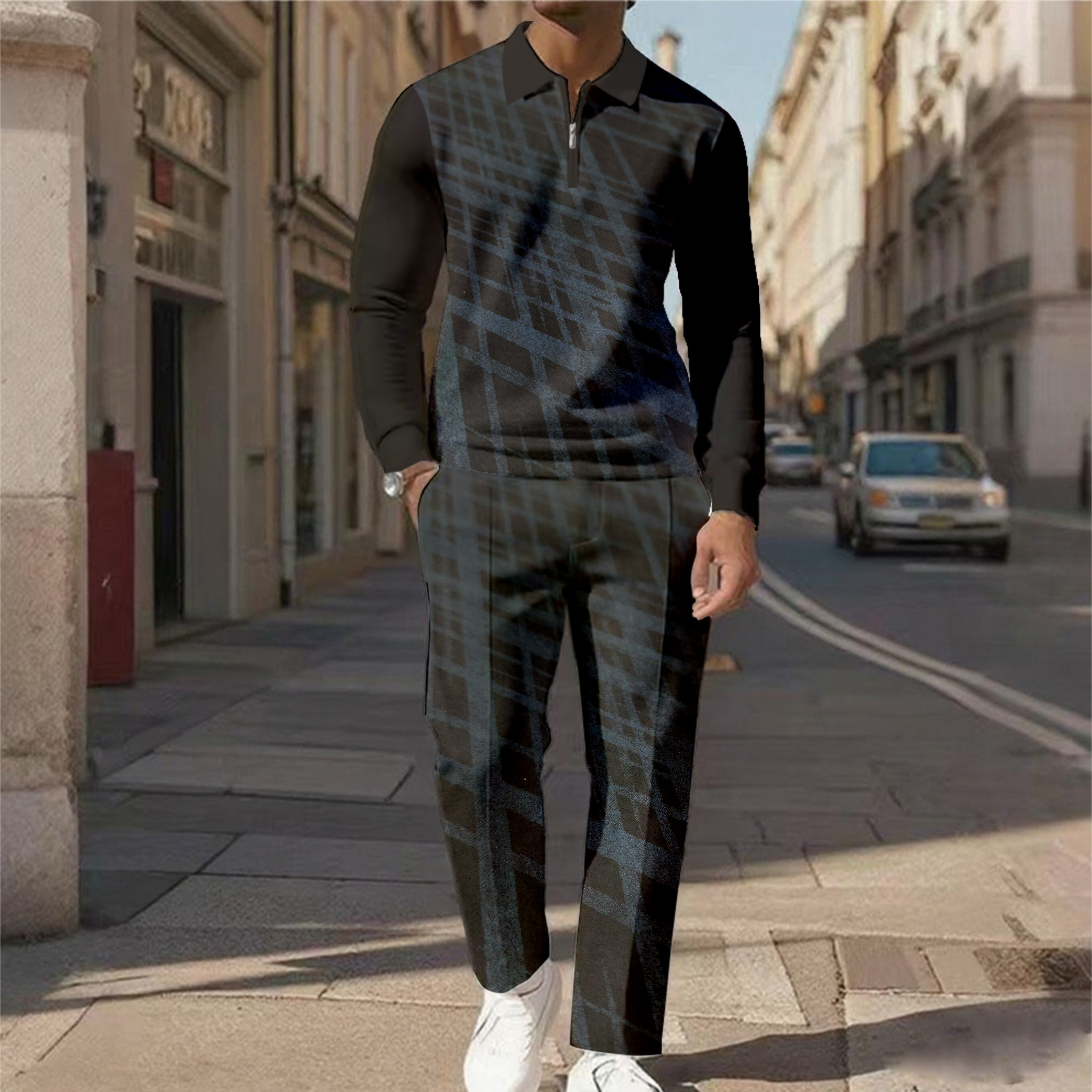 Men's Casual Color Matching Printed Polo-Collar Zipper Long Sleeved Trousers Two-Piece Set