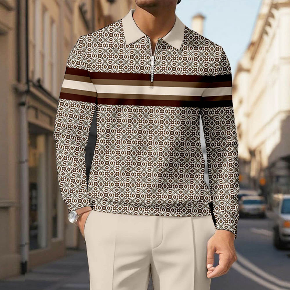Men's Casual Color Matching Vintage Geometric Printed Polo-Collar Zipper Long Sleeved Trousers Two-Piece Set