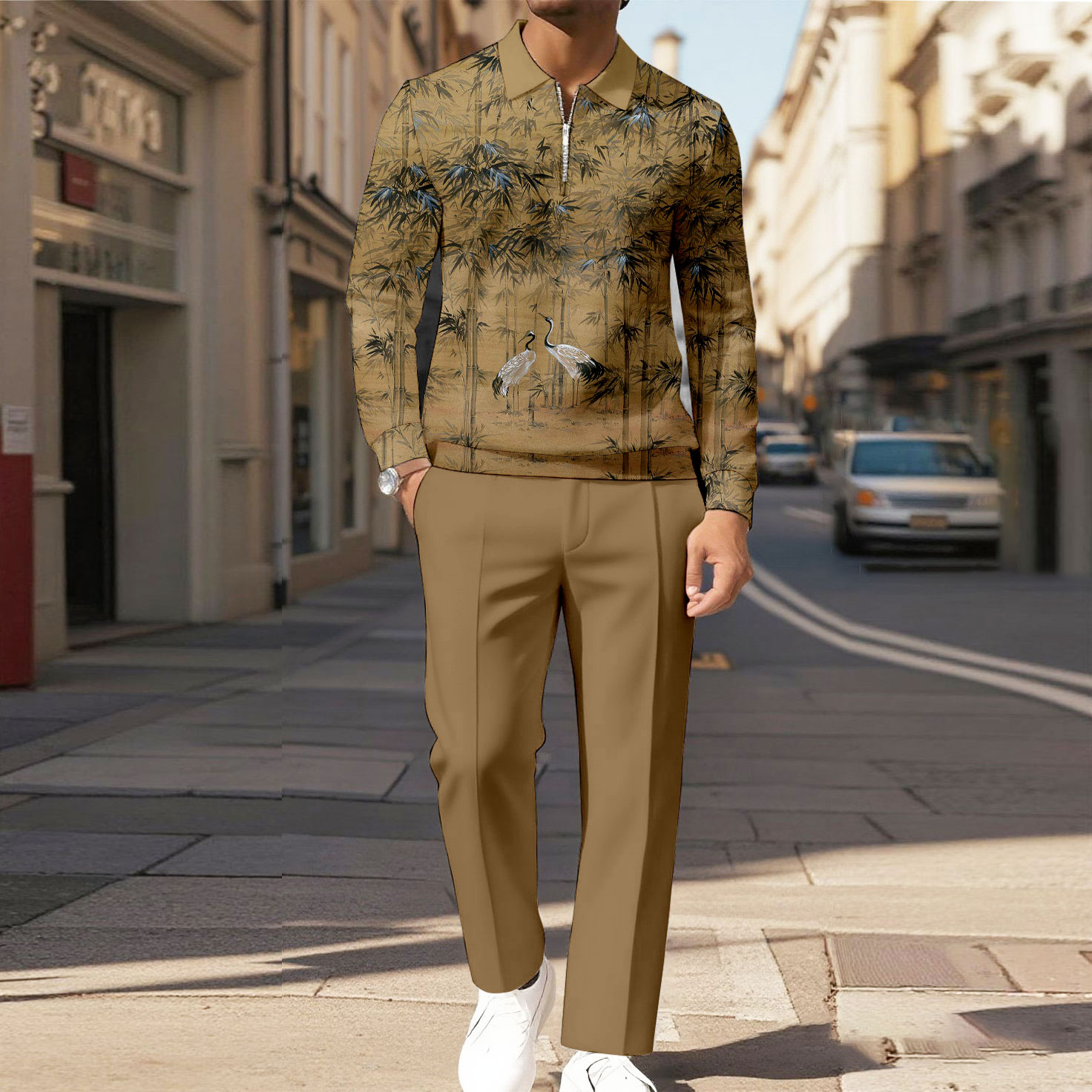 Men's White Crane Printed Polo-Collar Zipper Long Sleeved Trousers Two-Piece Set