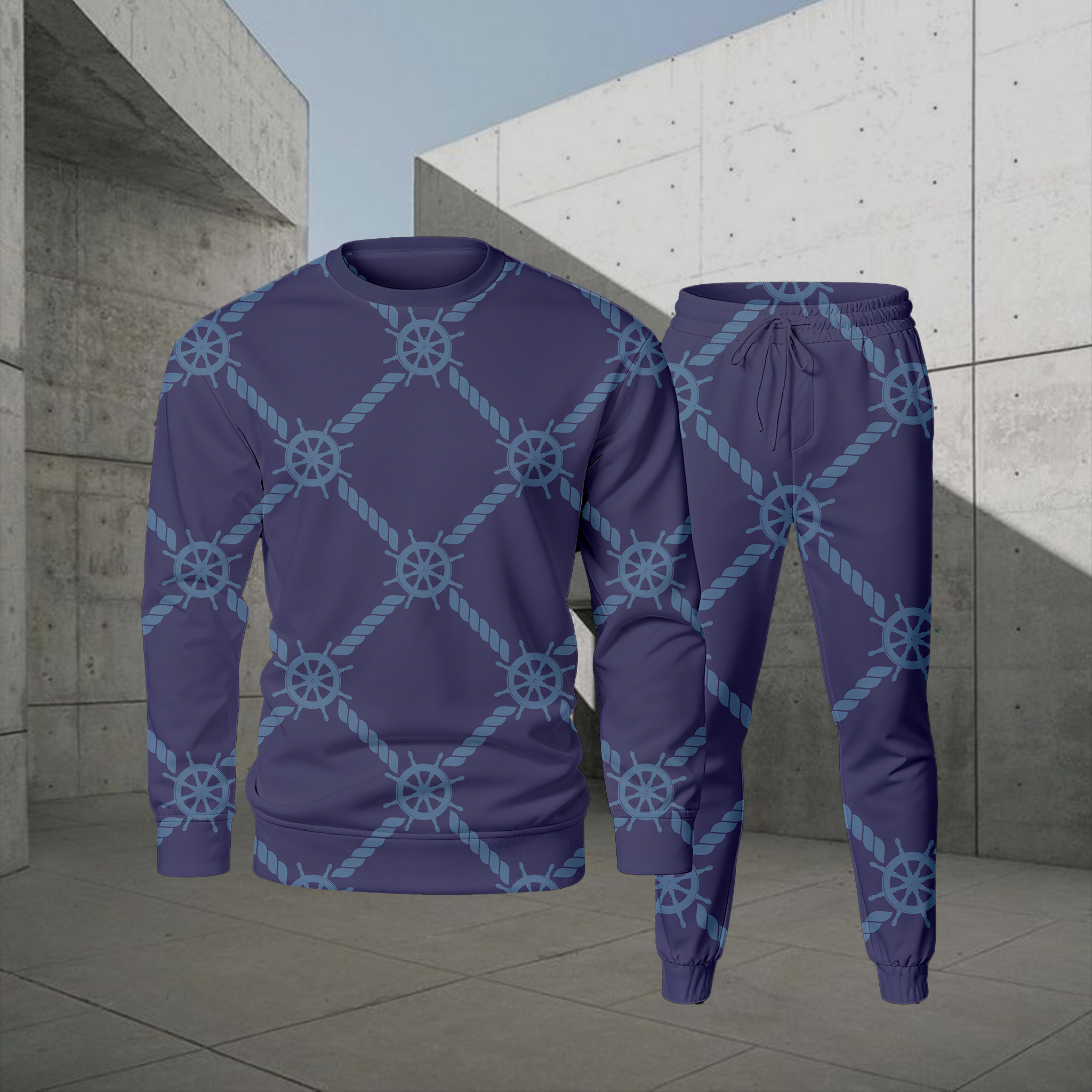 Men's Casual Color Matching Printed Round-Neck Long Sleeved Sweatshirts Trousers Two-Piece Set