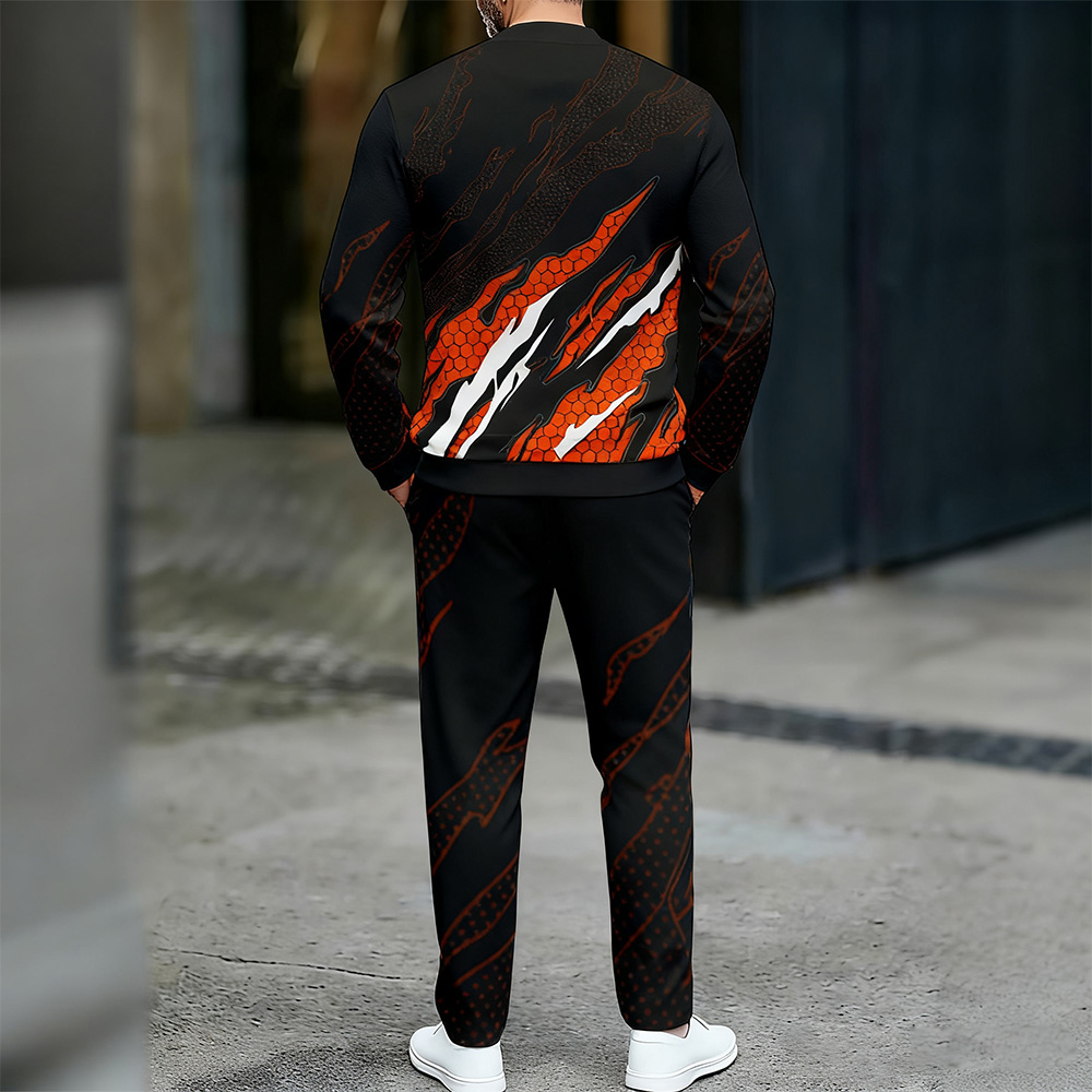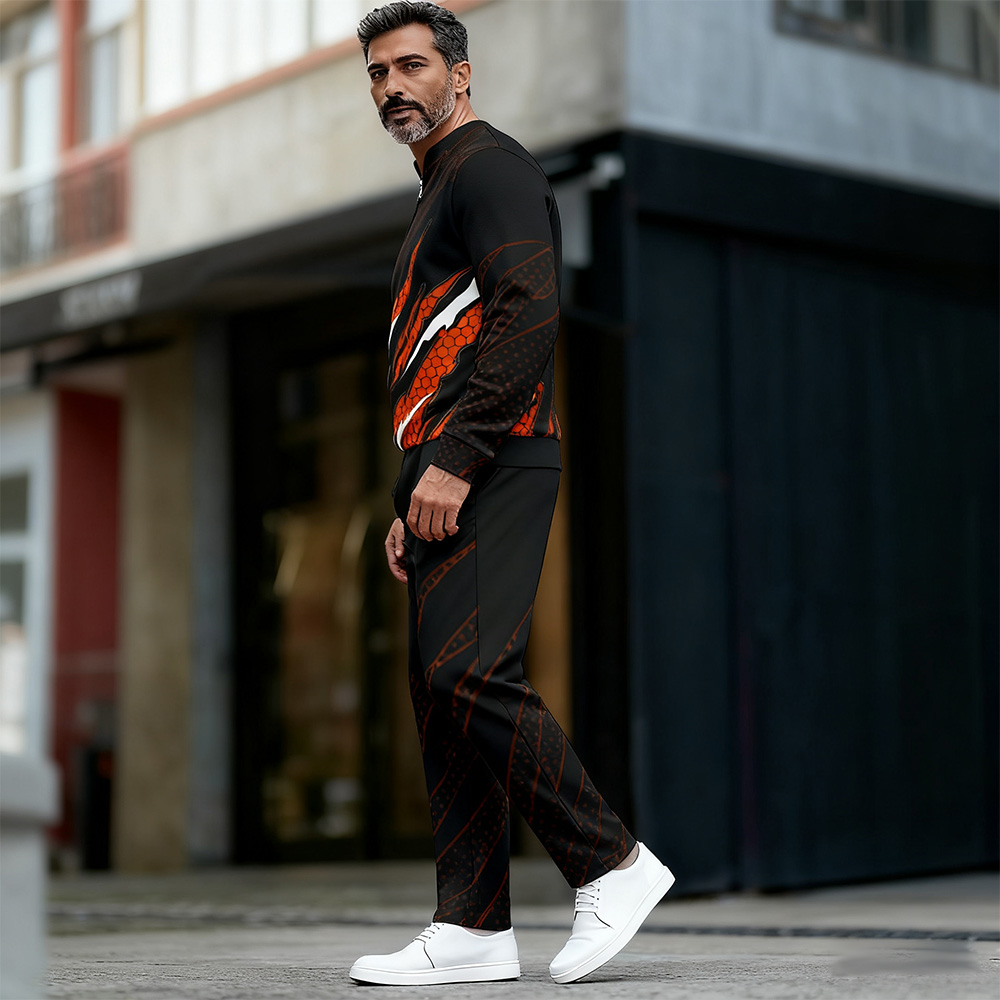 Men's Casual Color Matching Printed Round-Neck Zipper Long Sleeved Trousers Two-Piece Set