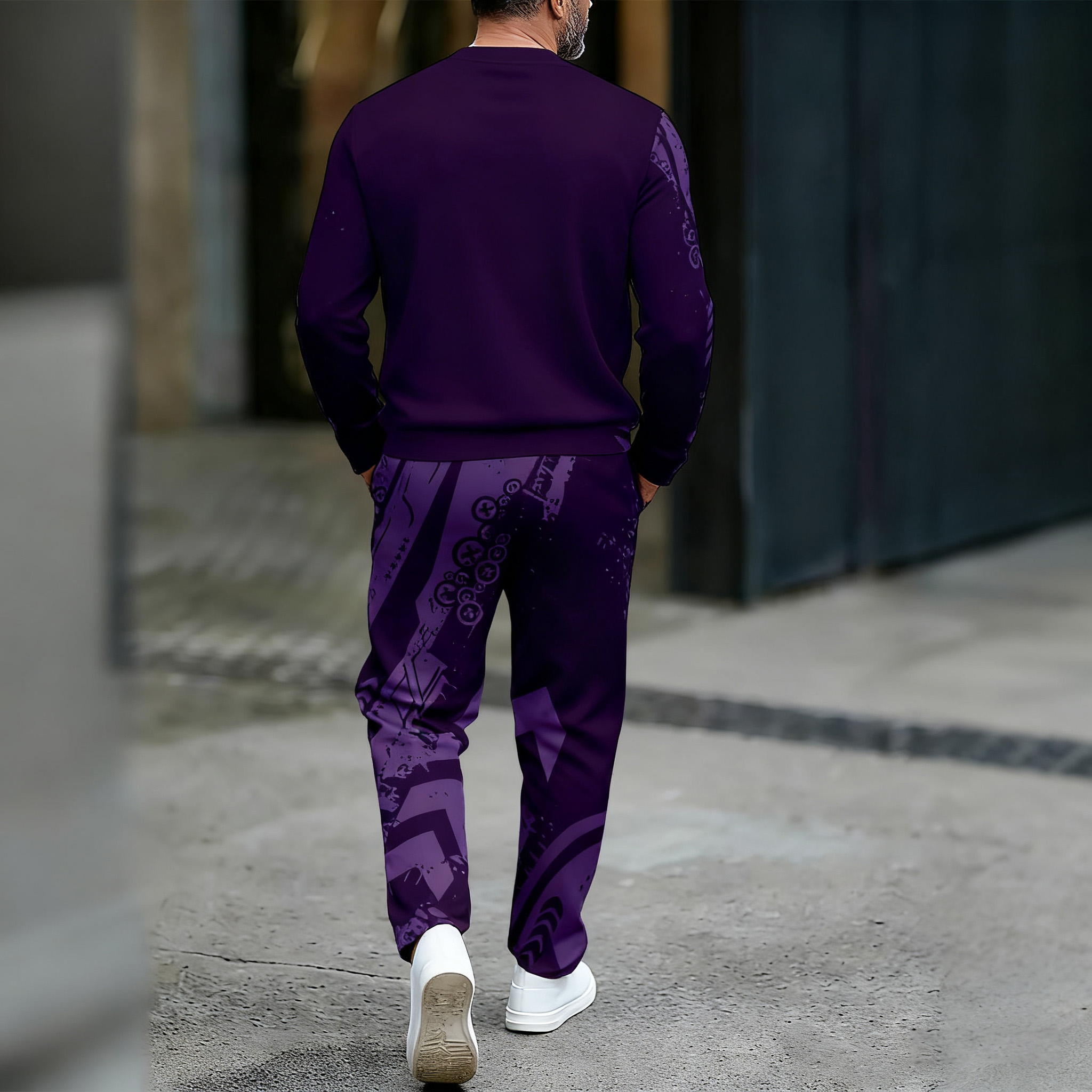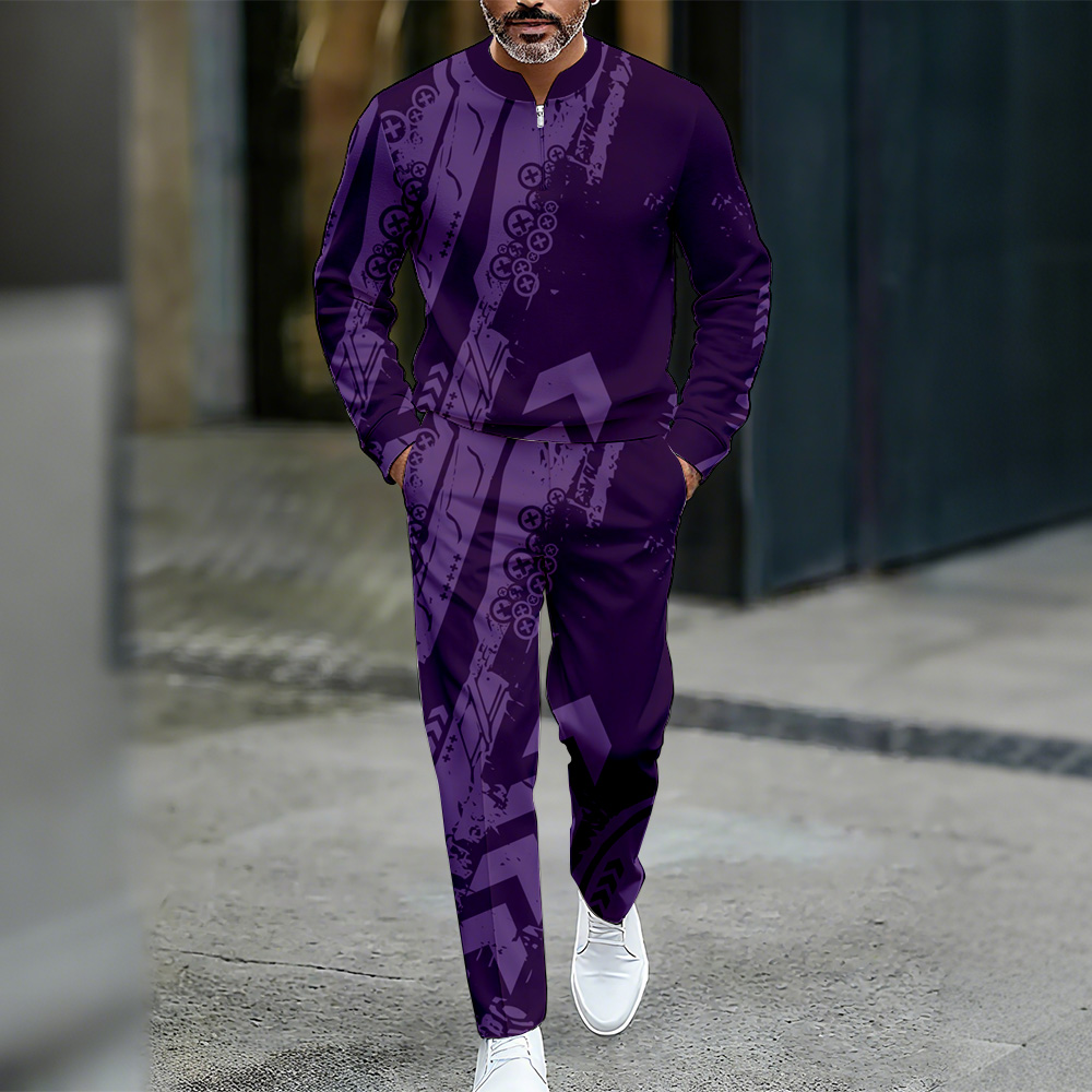 Men's Casual Color Matching Printed Round-Neck Zipper Long Sleeved Trousers Two-Piece Set