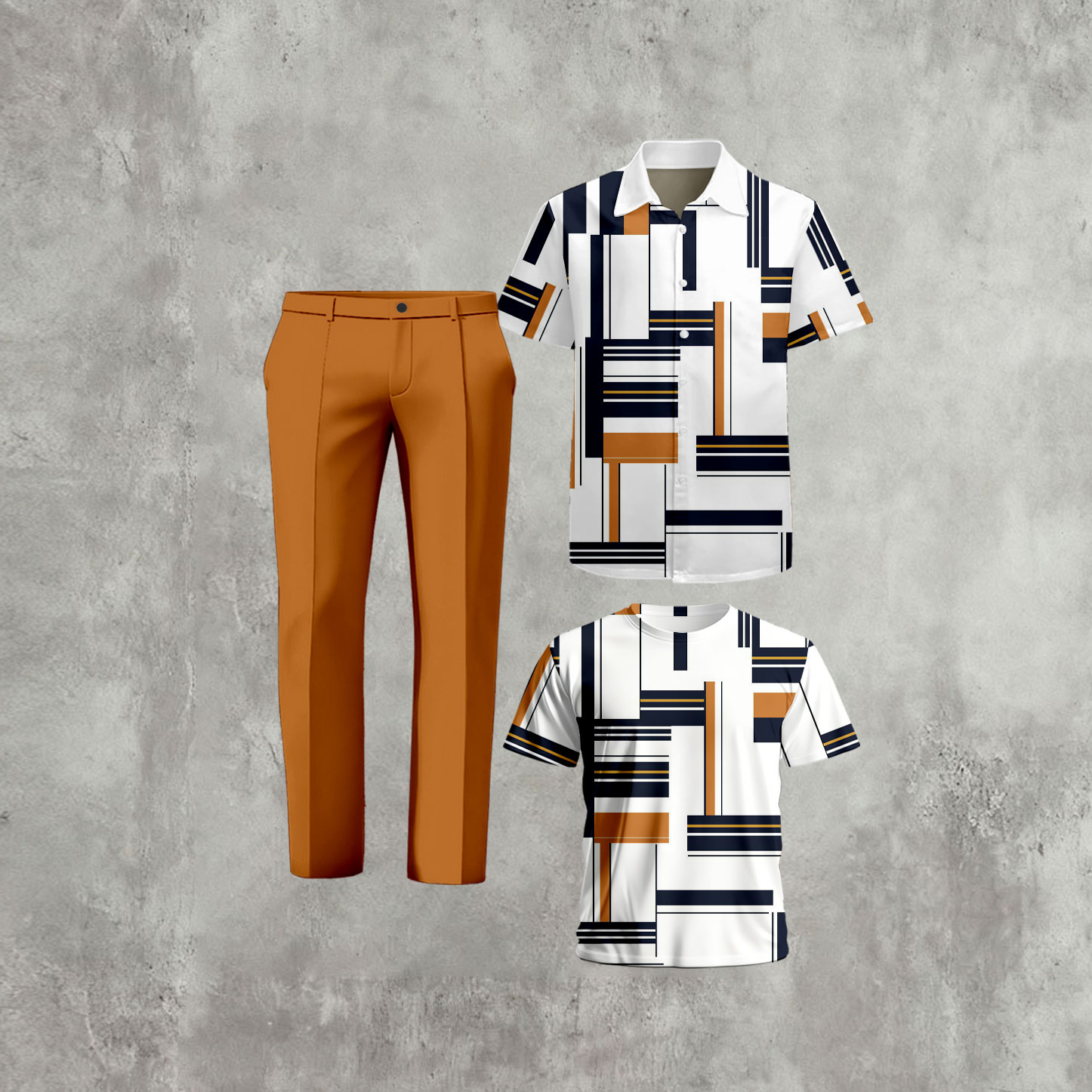 Men's Casual Orange & White Color Matching Geometric Printed Short Sleeved Shirt & T-Shirt & Trousers Three-Piece Set