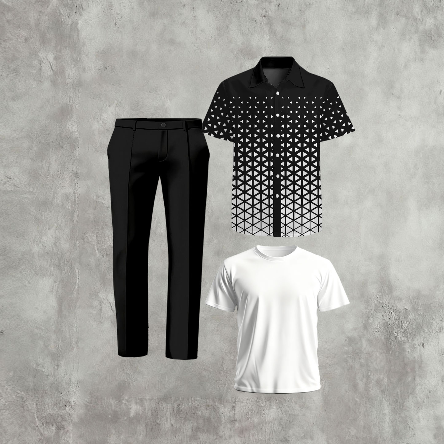 Men's Casual Black & White Color Matching Geometric Printed Short Sleeved Shirt & T-Shirt & Trousers Three-Piece Set