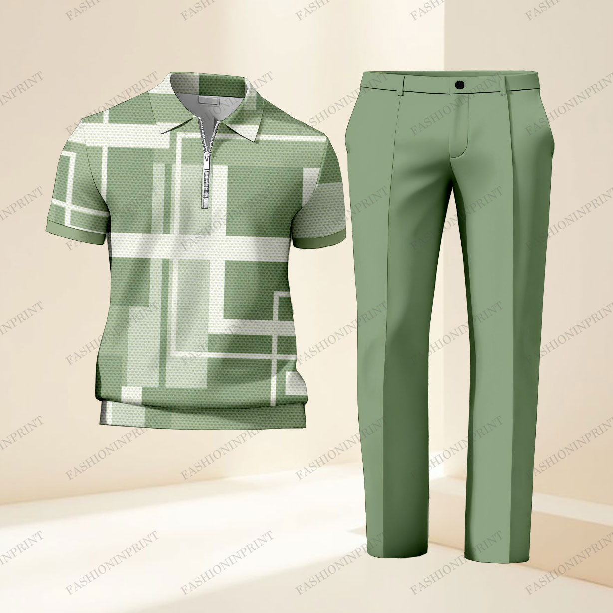 Men's Casual Green & Beige Color Matching Geometric Printed Short Sleeved Polo Shirt & Trousers Two-Piece Set