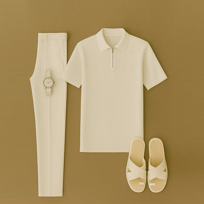 Men's Casual Solid Color Short Sleeved Zipper Polo Shirt & Trousers Two-Piece Set