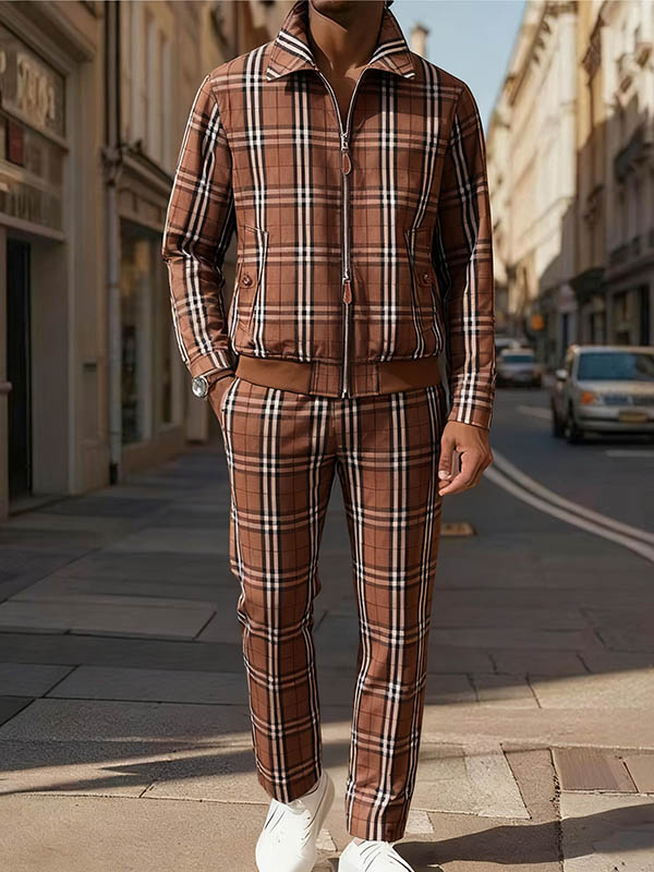 Men's Casual Color Matching Printed Zipper Long Sleeved Jacket Trousers Two-Piece Set