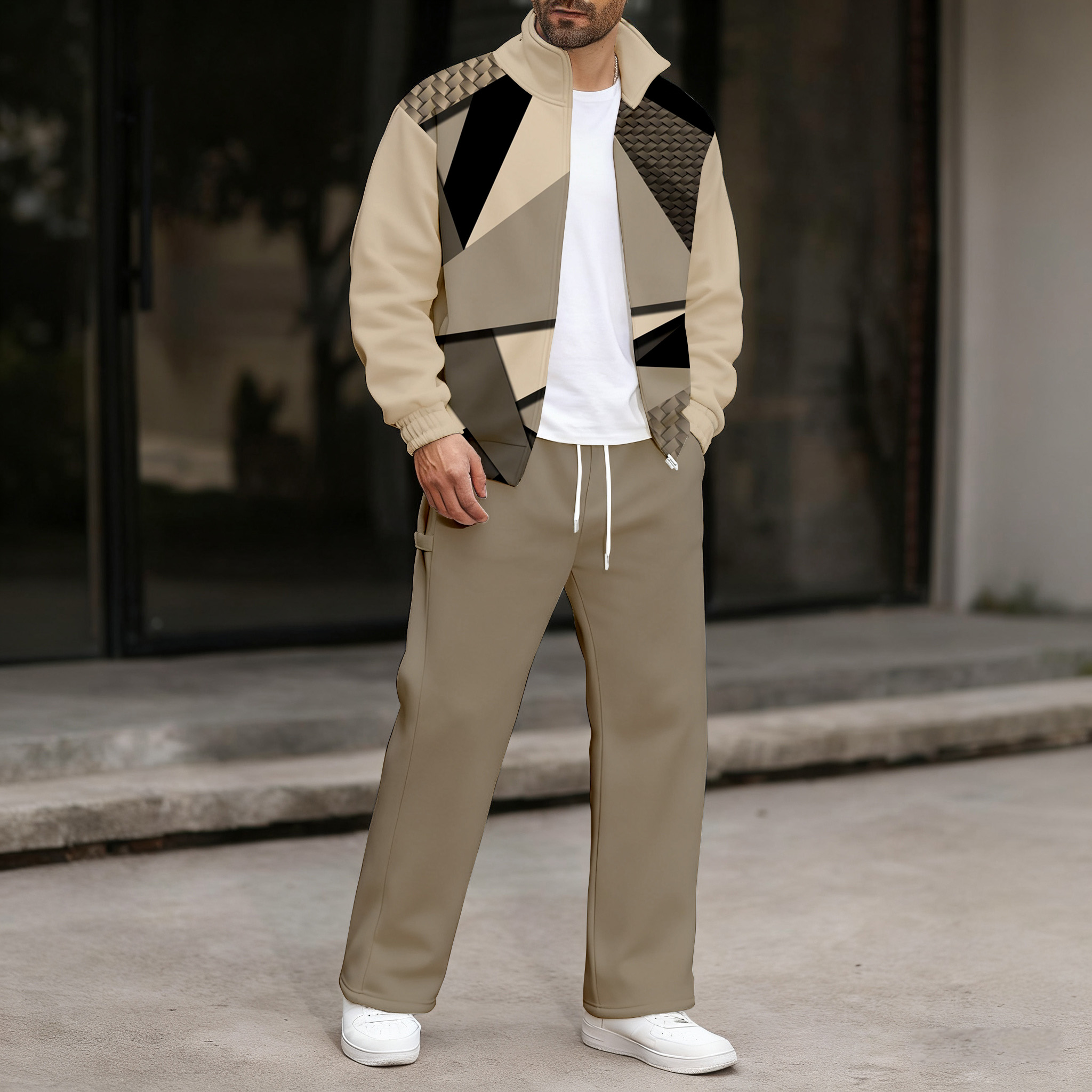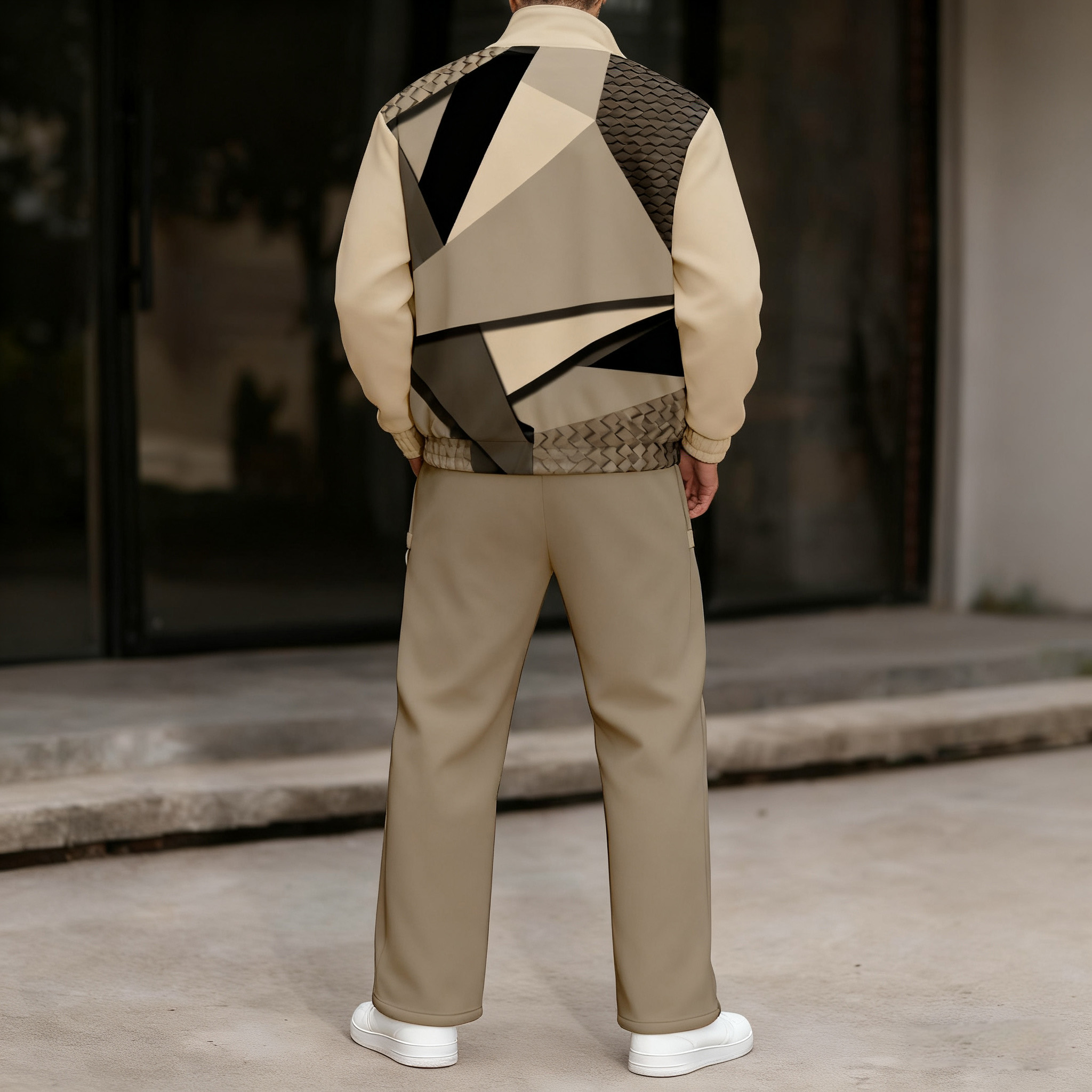 Men's Casual Color Matching Printed Zipper Long Sleeved Jacket Trousers Two-Piece Set