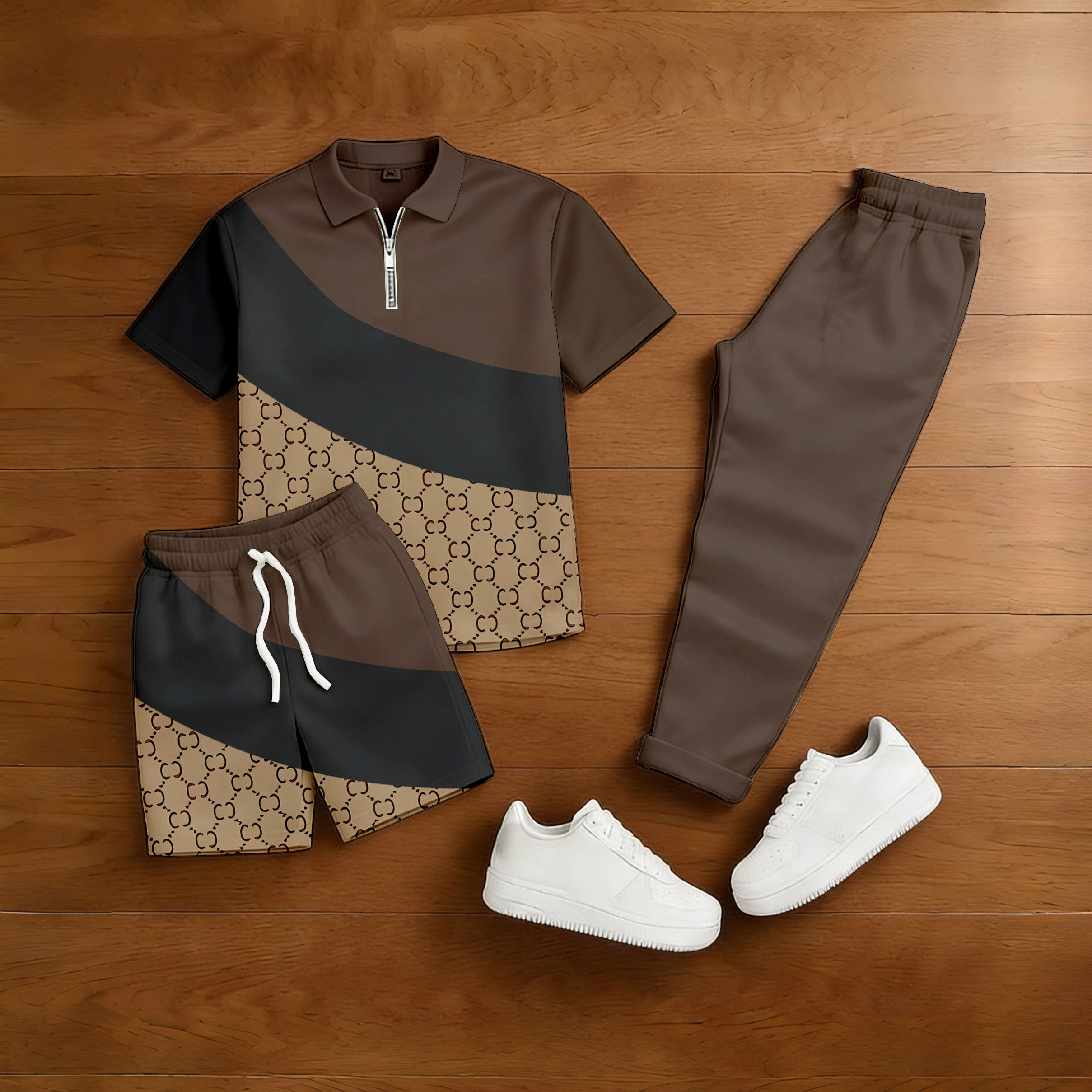 Men's Casual Coffee & Tan Color Matching Vintage Printed Zipper Short Sleeved Polo Shirt & Trousers & Shorts 3Pc Set