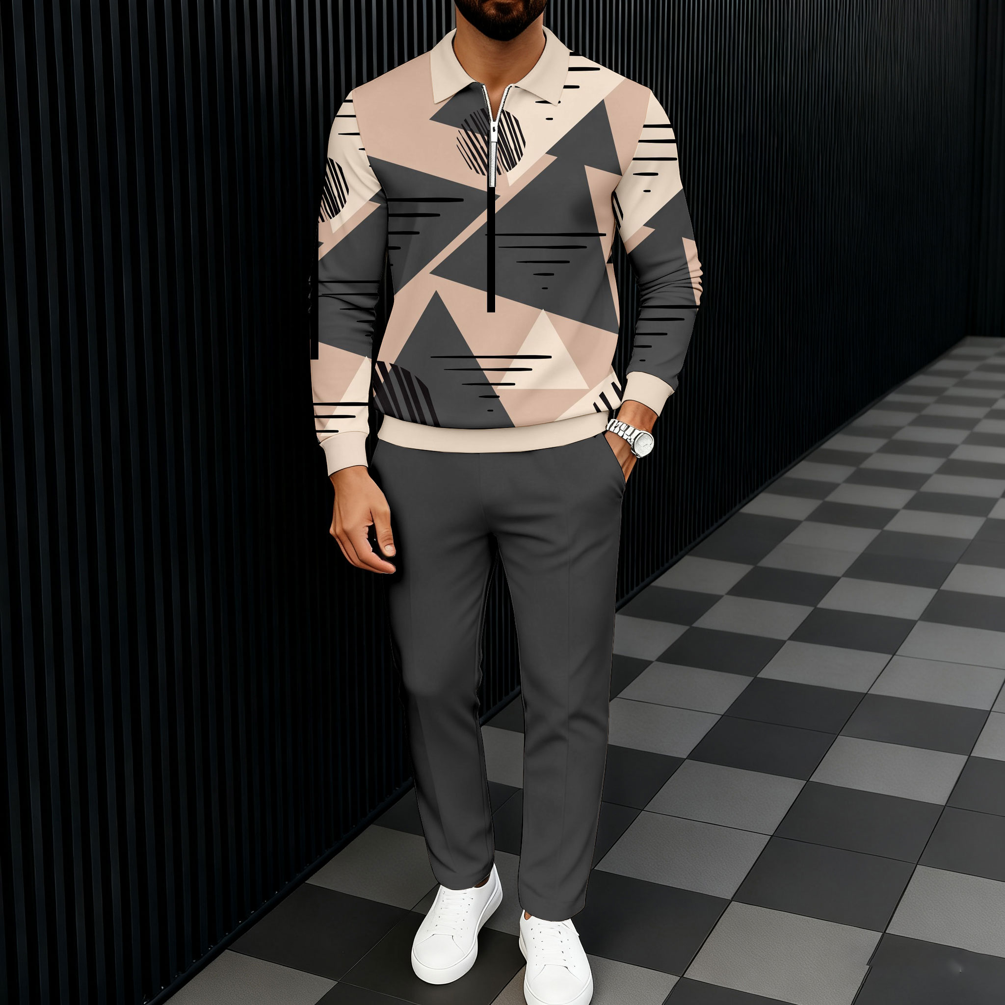 Men's Casual Geometric Patterns Polo-Collar Zipper Long Sleeved Dark Gray Trousers Two-Piece Set