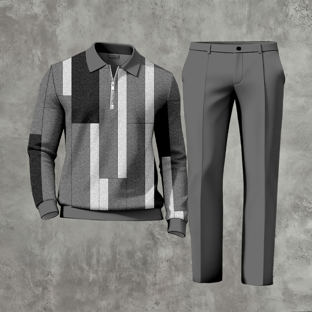 Men's Casual Gray Geometric Retro Print Polo Collar Zipper Long Sleeve Pants Two-Piece Set