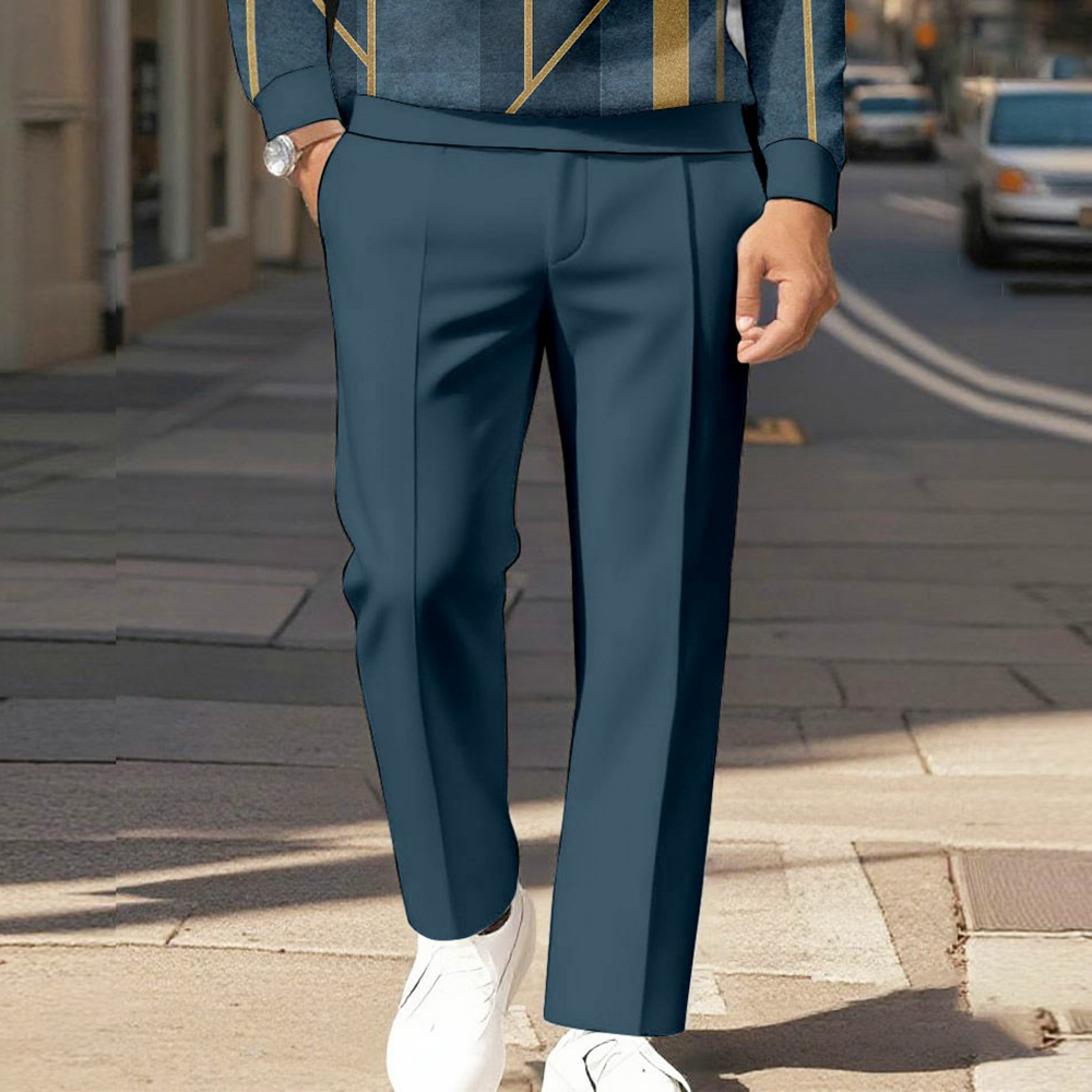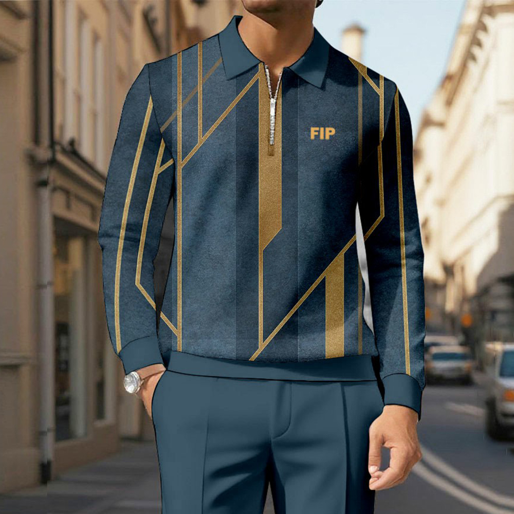 Men's Casual Navy Blue & Brown Color Matching Geometric Printed Polo-Collar Zipper Long Sleeved Trousers Two-Piece Set