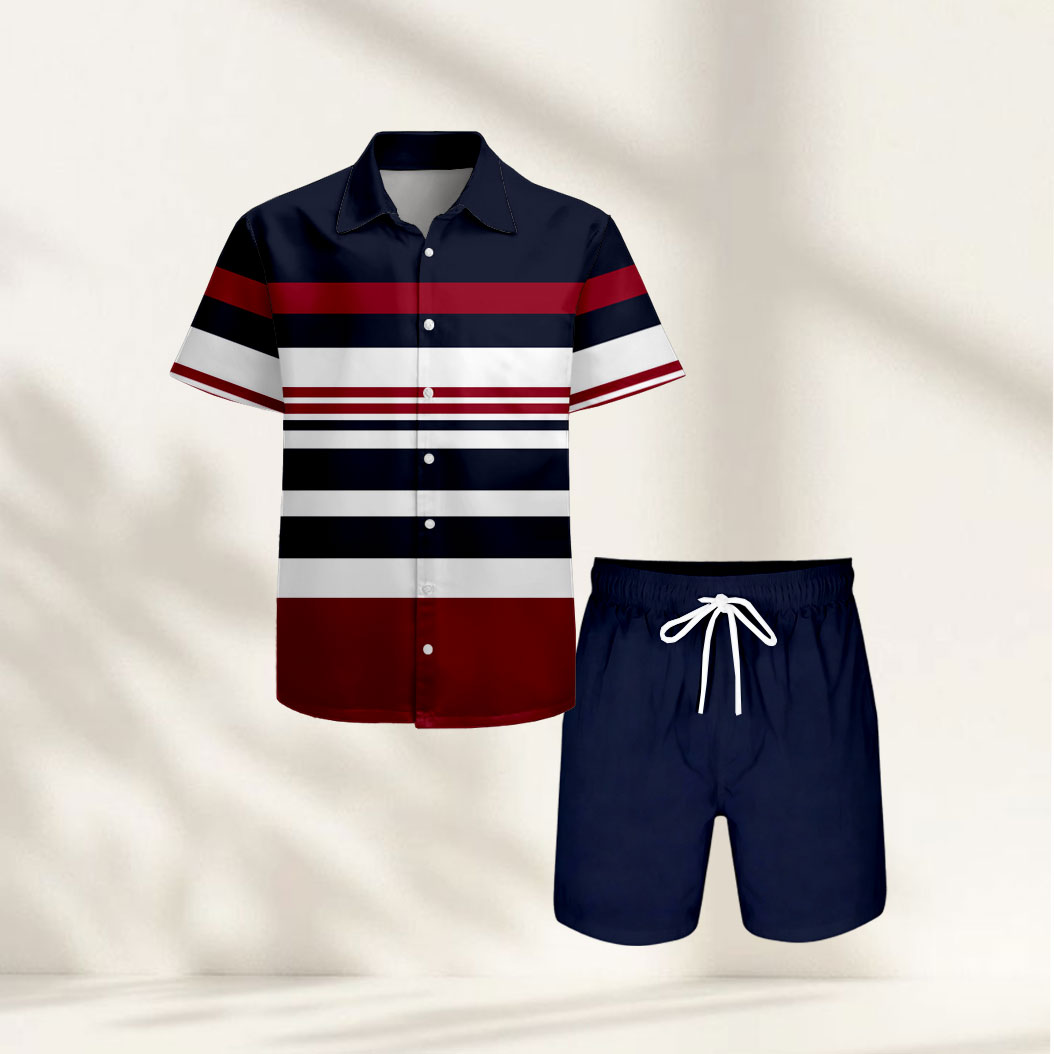 Men's Casual Navy Blue & White Color Matching Striped Print Short-Sleeve Shirt & Shorts Two-Piece Set