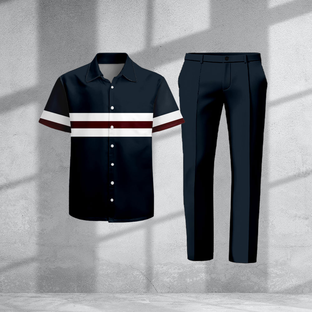 Men's Casual Navy Blue & White Color Matching Striped Print Short-Sleeve Shirt & Trousers Two-Piece Set