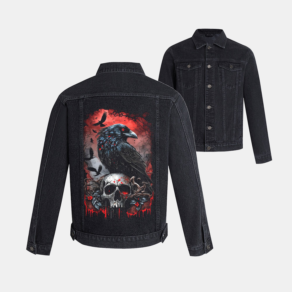 Men's Casual Dark-style Crows And Skeletons Printed Long-Sleeved Denim Jacket