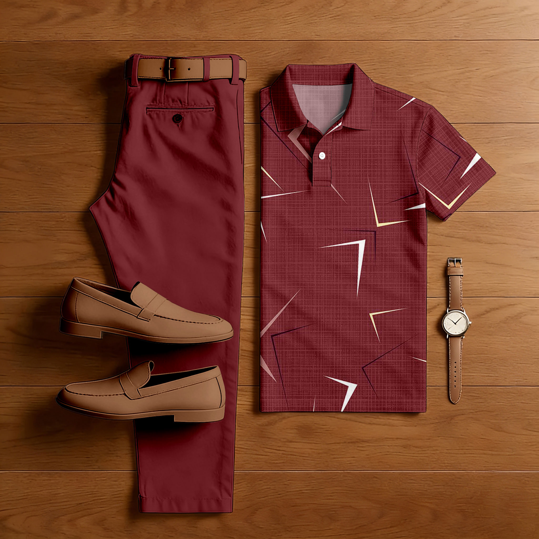 Men's Casual Red Color Matching Checkered Printed Short Sleeved Polo Shirt & Trousers Two-Piece Set