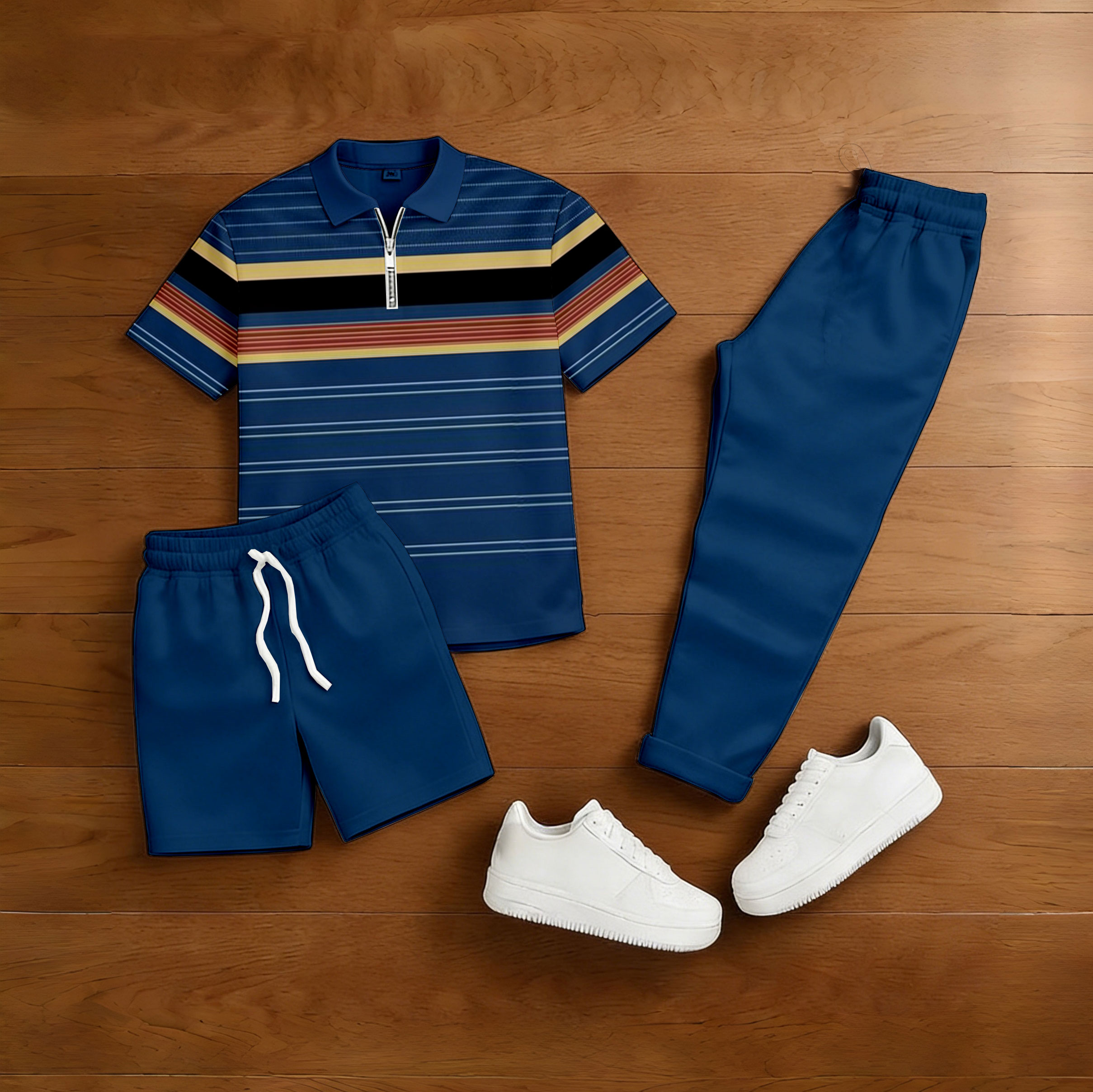 Men's Casual Royal Blue & Multi Color Matching Striped Printed Zipper Short Sleeved Polo Shirt & Trousers & Shorts 3Pc Set