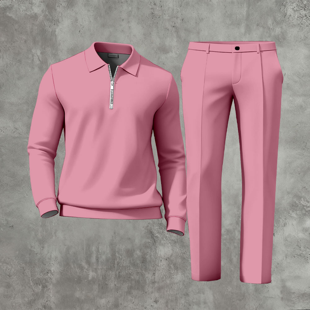 Men's Casual Solid Color Polo-Collar Zipper Long Sleeved Trousers Two-Piece Set