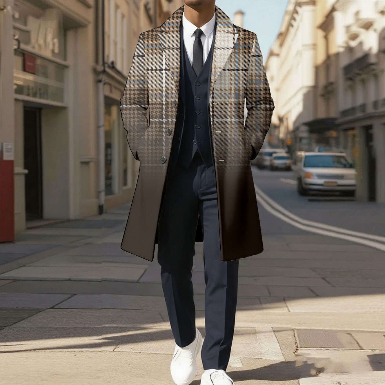 Men's Color Matching Printed Lapel-Collar Long Sleeved Wool Coats