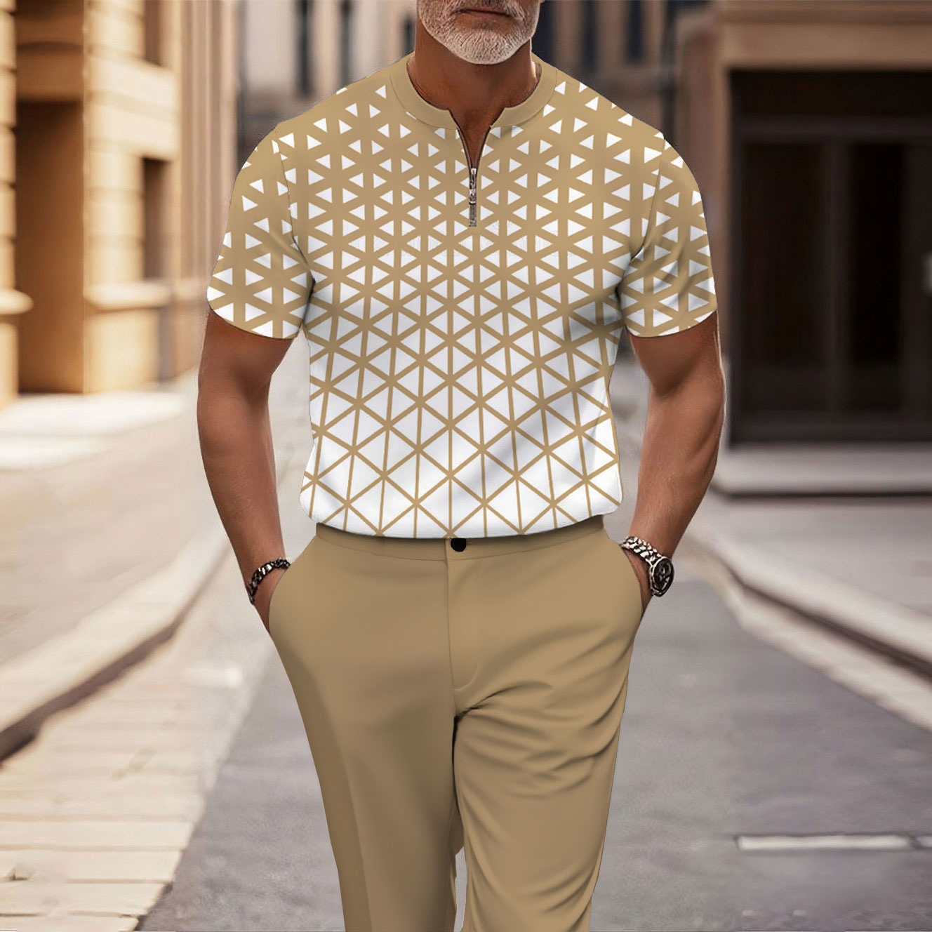 Men's Fashion Casual Round-Neck Zipper Geometric Printed Short-Sleeved Trousers Two-Piece Set