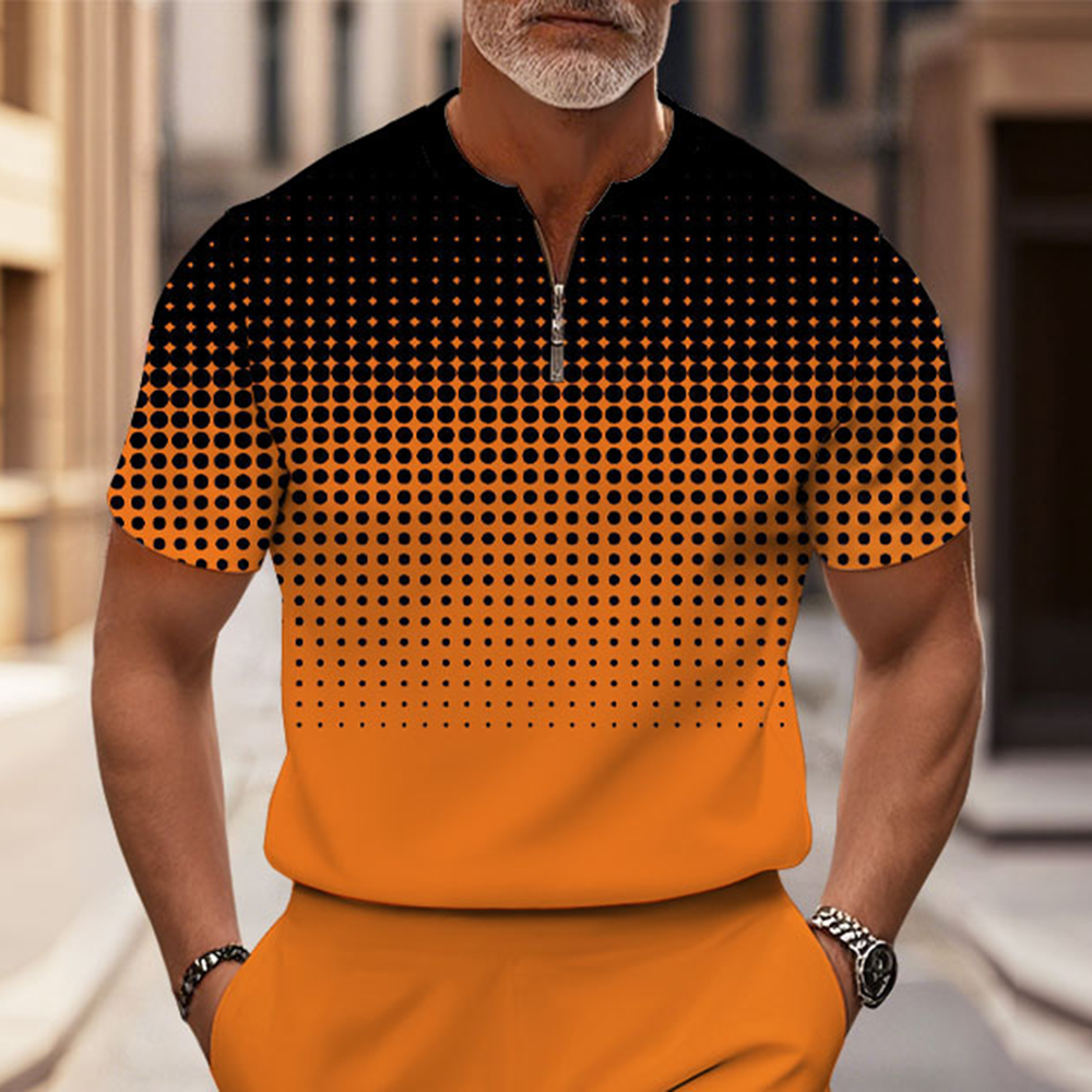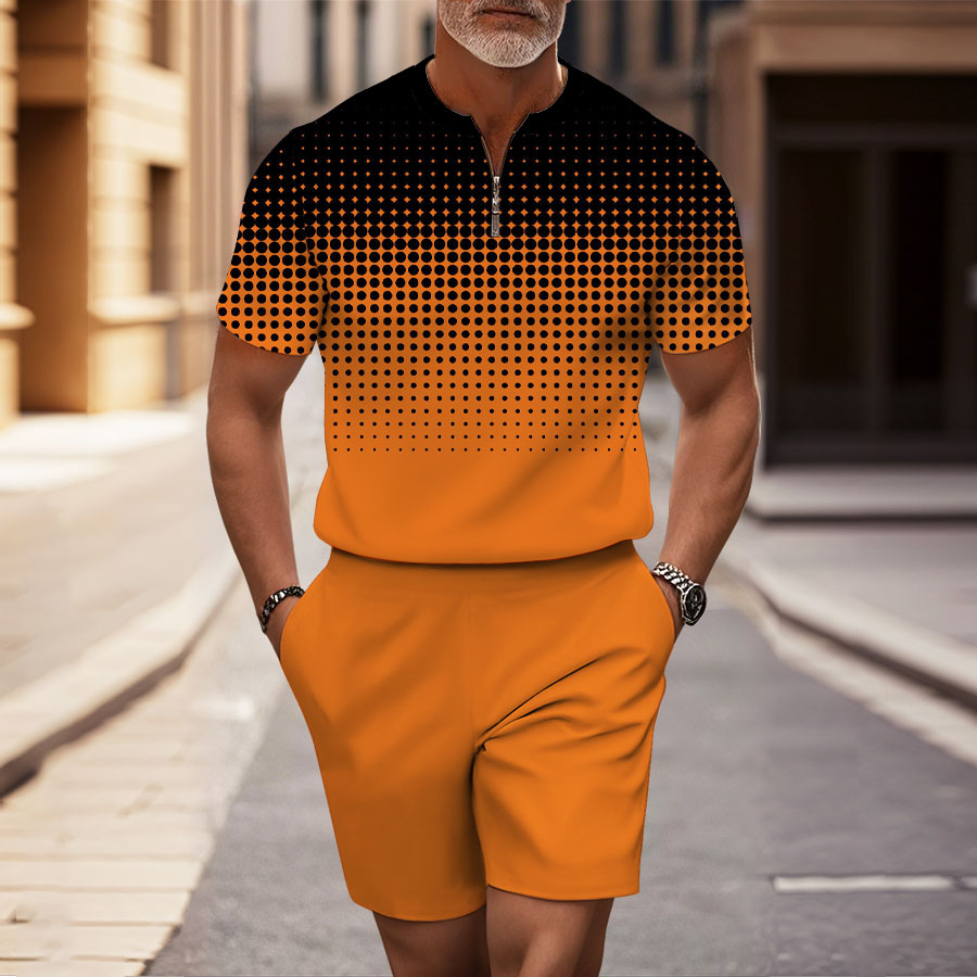 Men's Fashion Casual Orange & Black Color Matching Polka Dots Gradient Printed Round-Neck Zipper Short-Sleeved Two-Piece Set