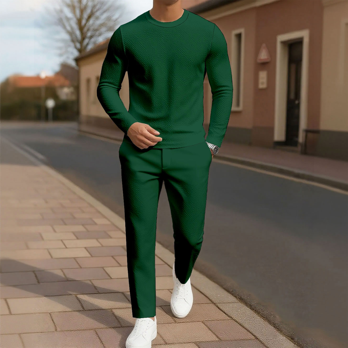 Men's Solid Color Round Neck Long Sleeved Trousers Two-Piece Set