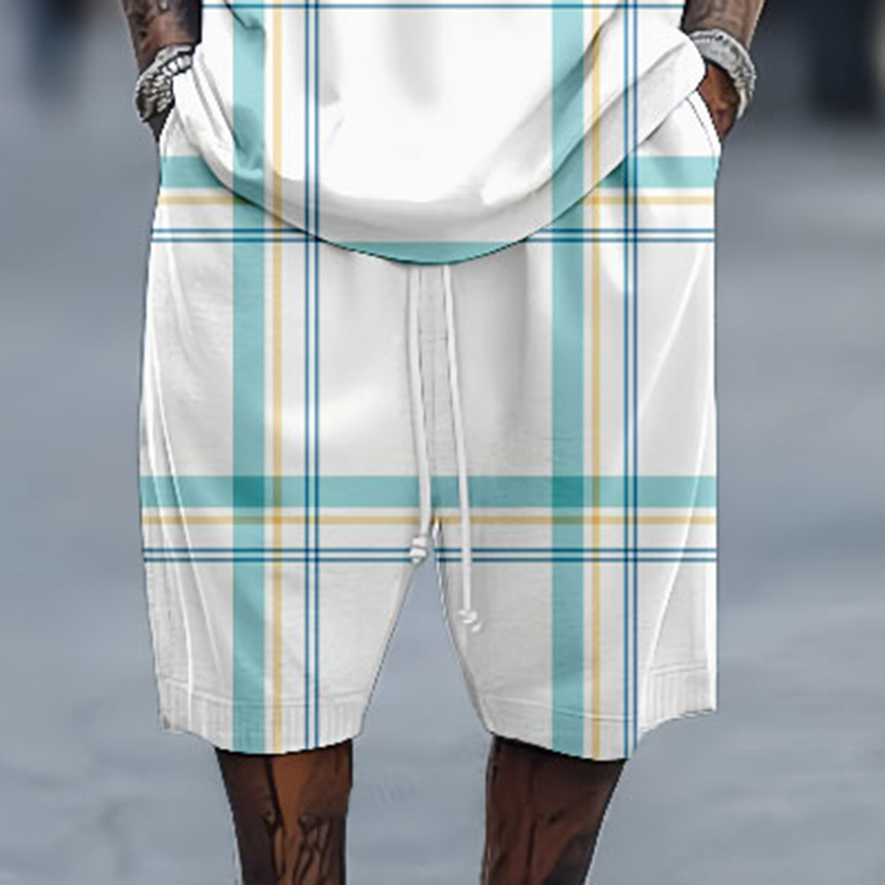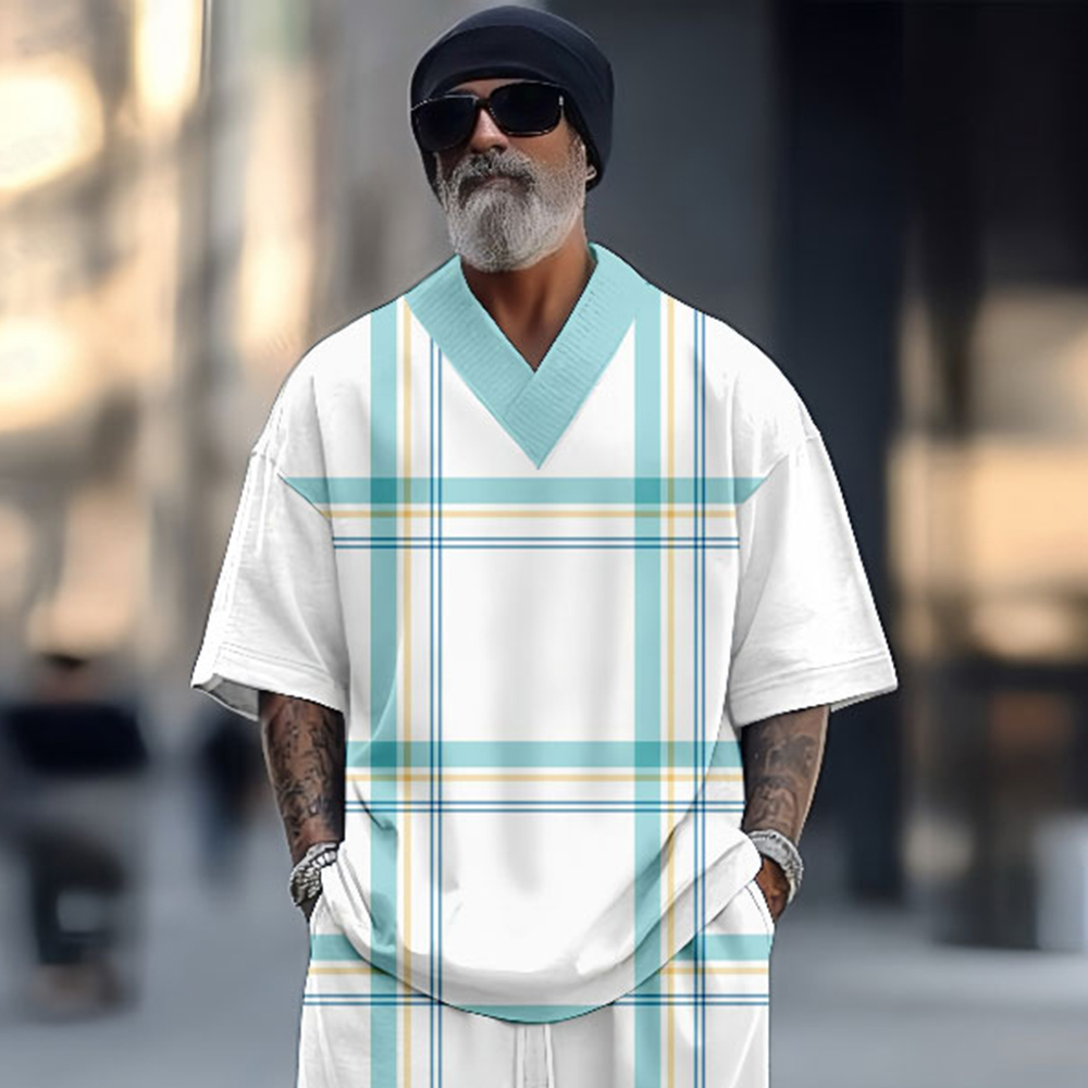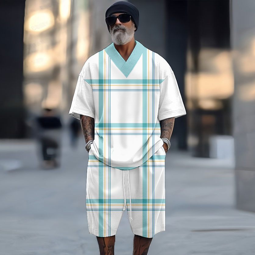 Men's Styles Casual Matching Striped Printedr V-Neck Short-Sleeved Two-Piece Set