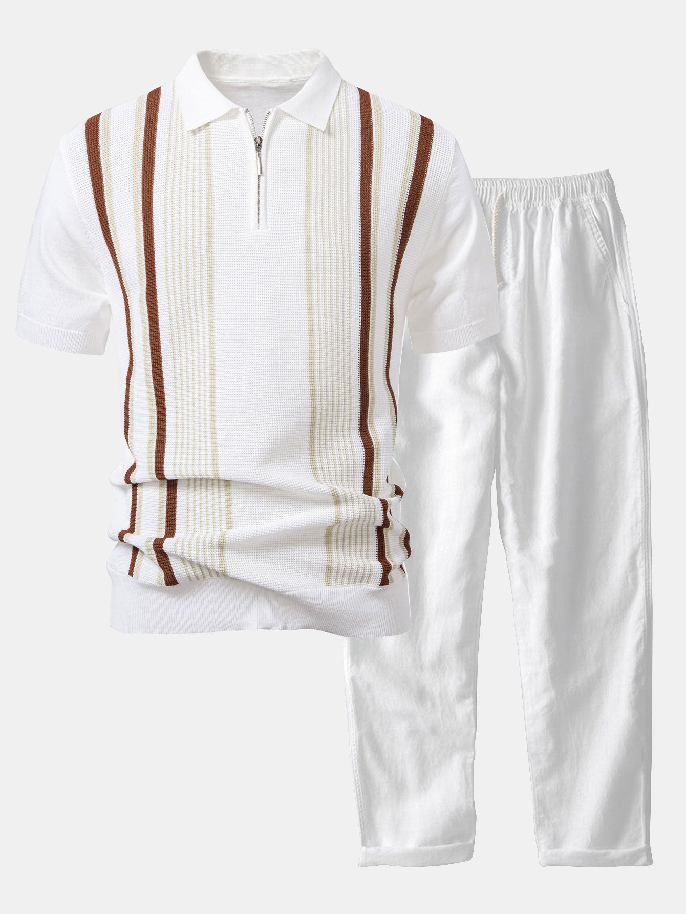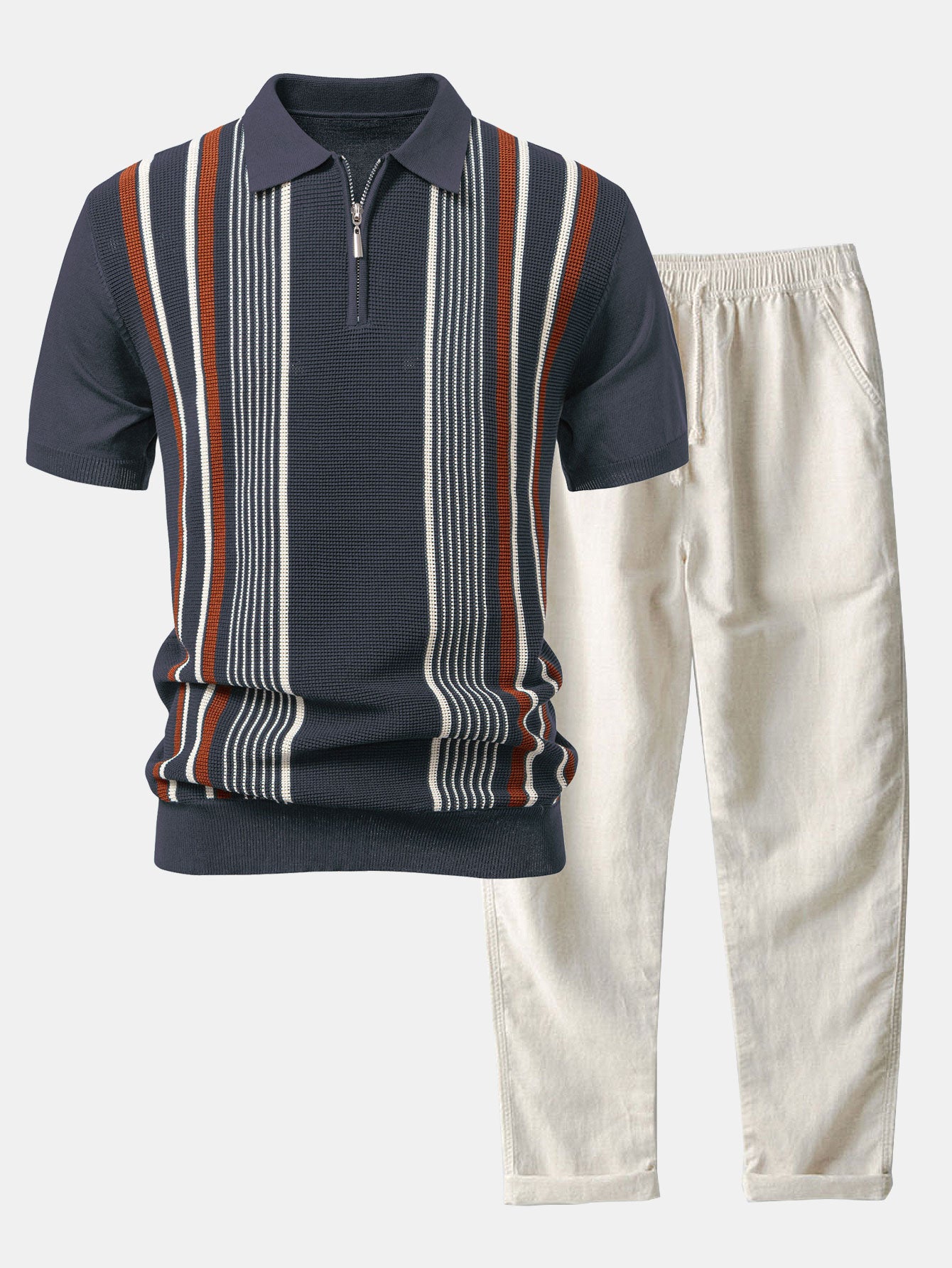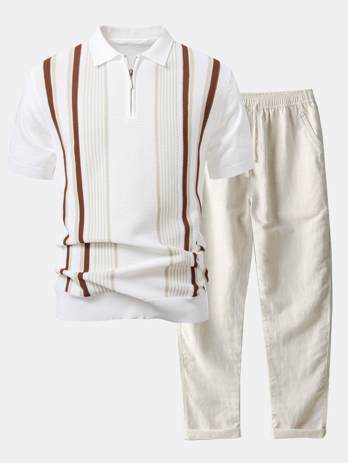 Stay cool and stylish in this versatile stripe knit zip up polo shirt & straight leg linen pants set. The polo's unique zip-up design and bold stripes bring a modern twist to a classic silhouette, while the breathable linen pants keep you comfortable and sharp in warm weather. Whether you're headed to brunch or strolling by the coast, this set delivers effortless sophistication and comfort.