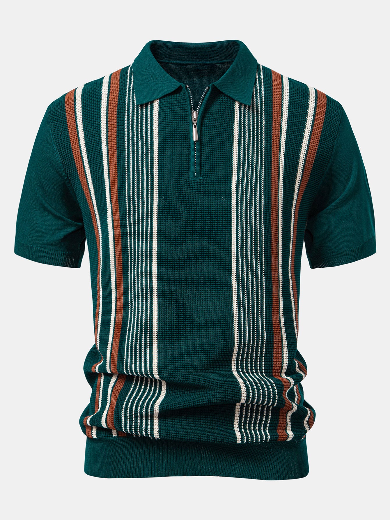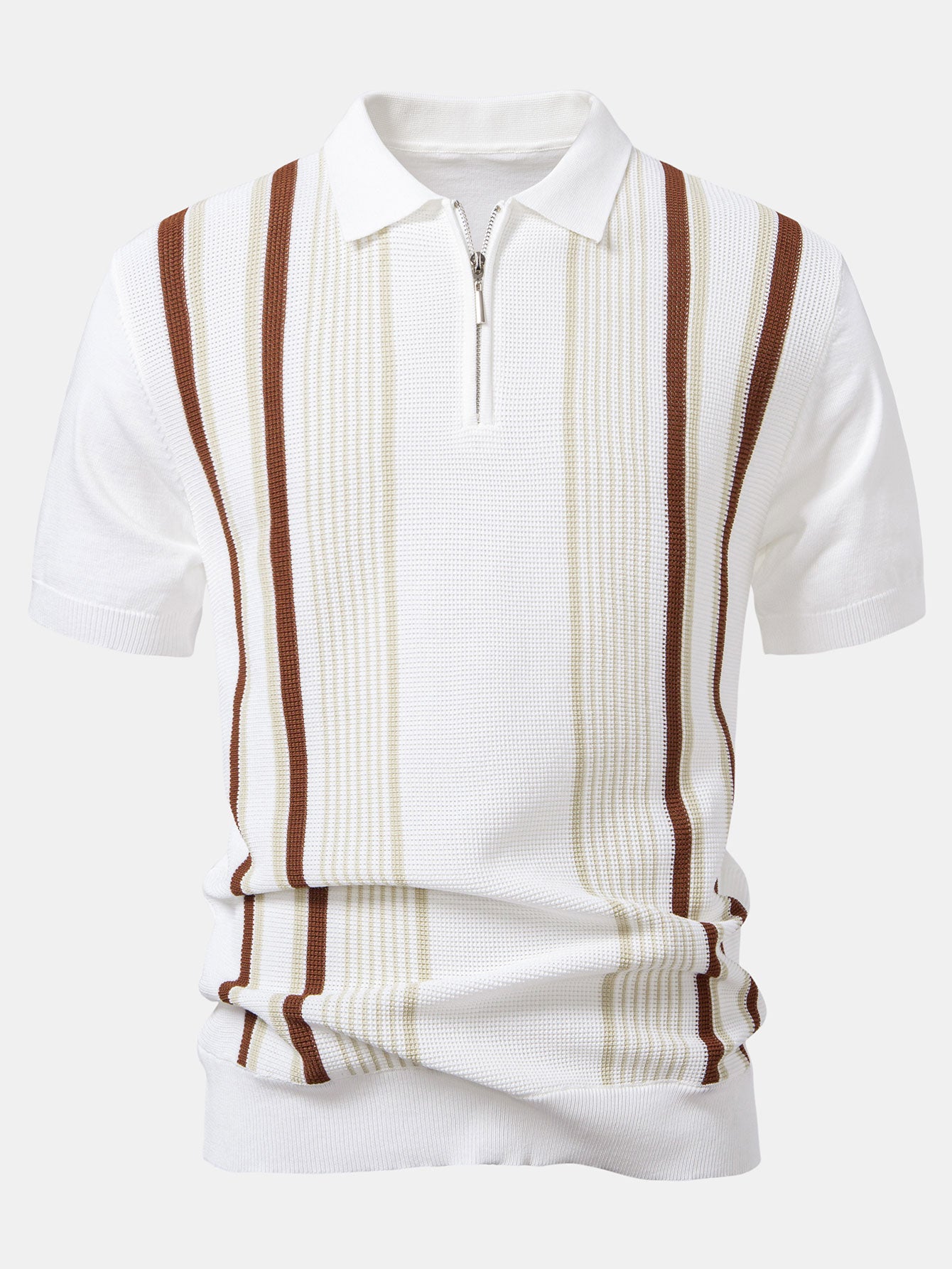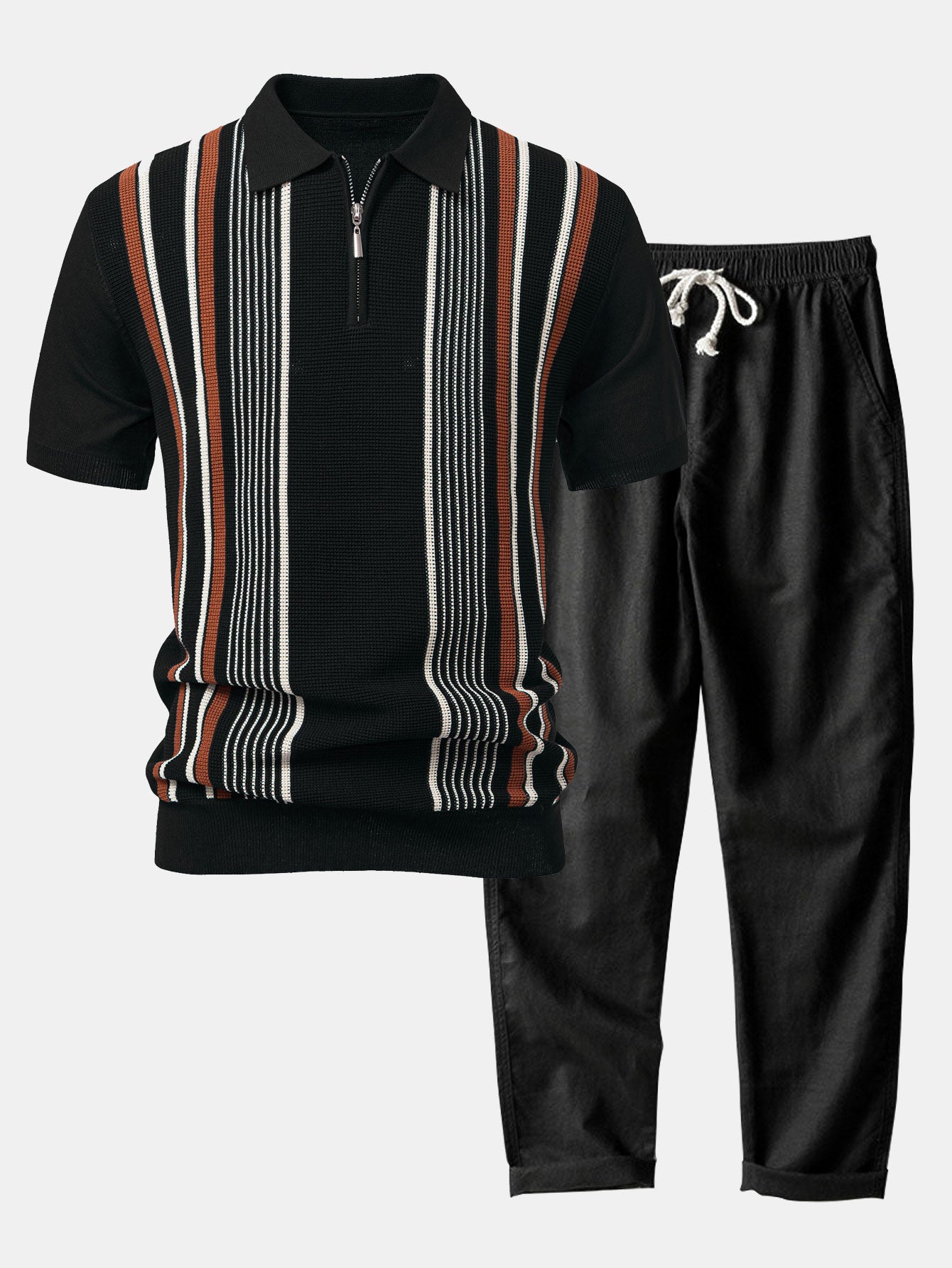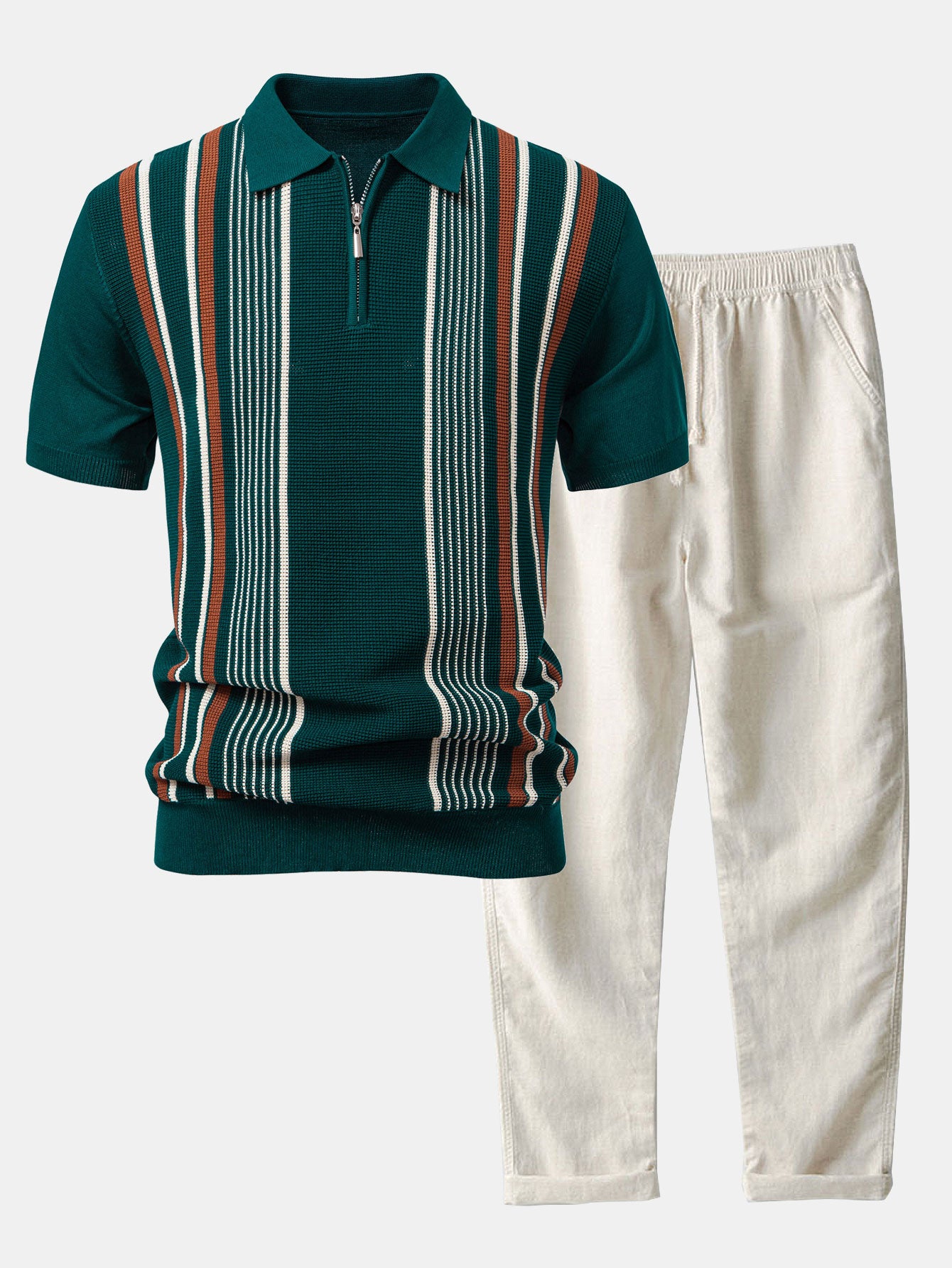 Stay cool and stylish in this versatile stripe knit zip up polo shirt & straight leg linen pants set. The polo's unique zip-up design and bold stripes bring a modern twist to a classic silhouette, while the breathable linen pants keep you comfortable and sharp in warm weather. Whether you're headed to brunch or strolling by the coast, this set delivers effortless sophistication and comfort.