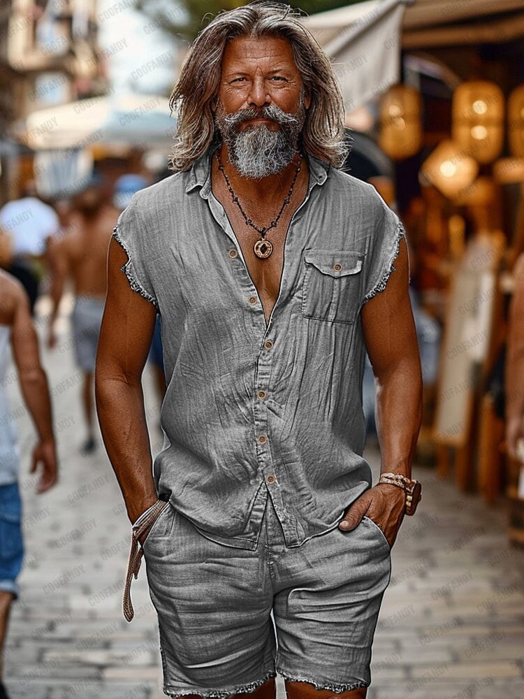 • Top Details: Sleeveless, raw edge design on cuffs and pants, one chest pocket, button closure, shirt collar