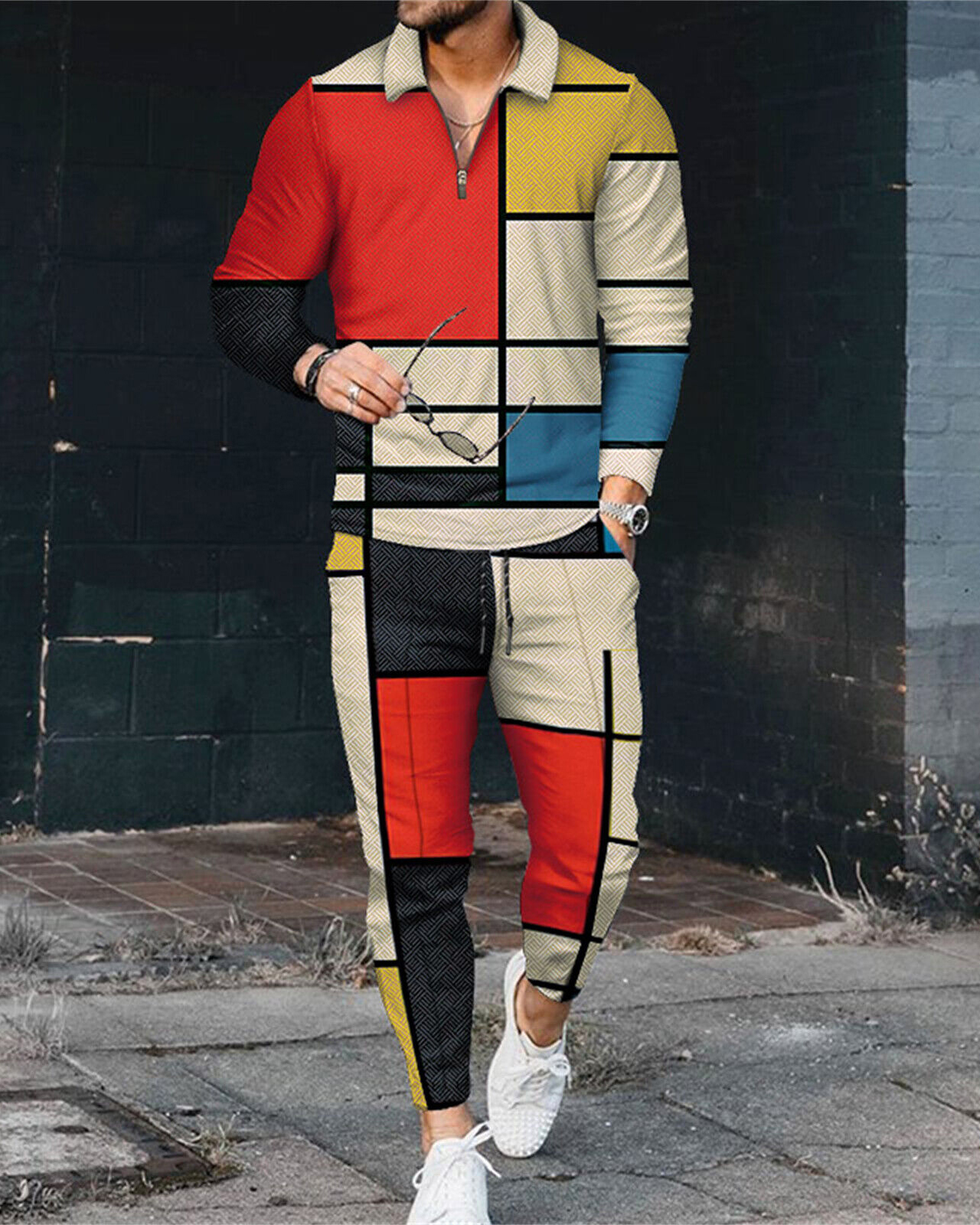 Suitmens Men's Abstract Colorful Geometry Long Sleeve Zipped POLO Trousers Set 0263