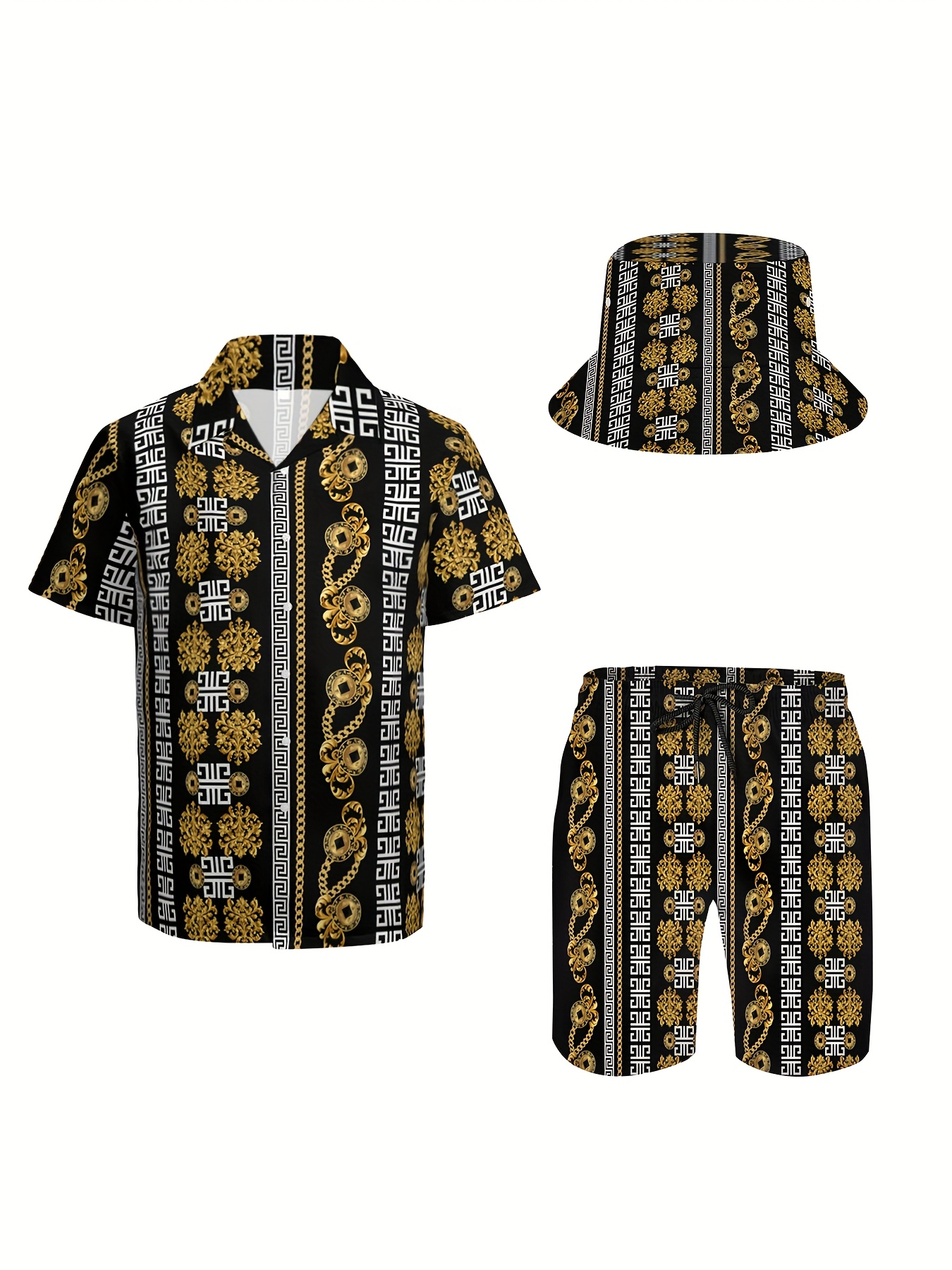 3pcs Men's Hawaiian Black & Gold Baroque Printed Short Sleeves Shirt & Short & Fisherman's Hat